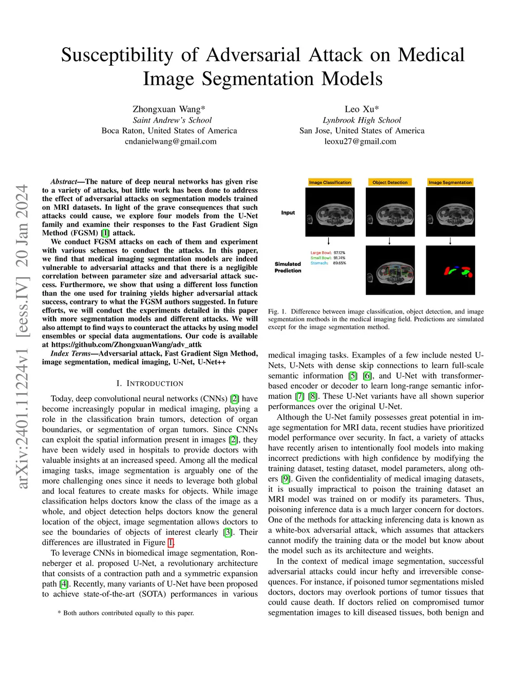 The nature of deep neural networks has given rise to a variety of attacks, but little work has been done to address the effect of adversarial attacks on segmentation models trained on MRI datasets. In light of the grave consequences that such attacks could cause, we explore four models from the U-Net family and examine their responses to the Fast Gradient Sign Method (FGSM) attack. We conduct FGSM attacks on each of them and experiment with various schemes to conduct the attacks. In this paper, we find that medical imaging segmentation models are indeed vulnerable to adversarial attacks and that there is a negligible correlation between parameter size and adversarial attack success. Furthermore, we show that using a different loss function than the one used for training yields higher adversarial attack success, contrary to what the FGSM authors suggested. In future efforts, we will conduct the experiments detailed in this paper with more segmentation models and different attacks. We will also attempt to find ways to counteract the attacks by using model ensembles or special data augmentations. Our code is available at https://github.com/ZhongxuanWang/adv_attk