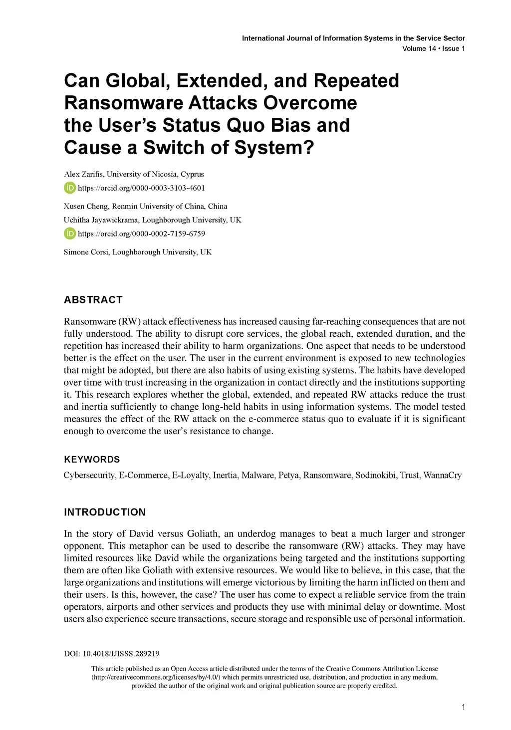 Ransomware attack effectiveness has increased causing far reaching consequences that are not fully understood. The ability to disrupt core services, the global reach, extended duration, and the repetition has increased their ability to harm organizations. One aspect that needs to be understood better is the effect on the user. The user in the current environment is exposed to new technologies that might be adopted, but there are also habits of using existing systems. The habits have developed over time with trust increasing in the organization in contact directly and the institutions supporting it. This research explores whether the global, extended, and repeated RW attacks reduce the trust and inertia sufficiently to change long-held habits in using information systems. The model tested measures the effect of the RW attack on the e-commerce status quo to evaluate if it is significant enough to overcome the users resistance to change.