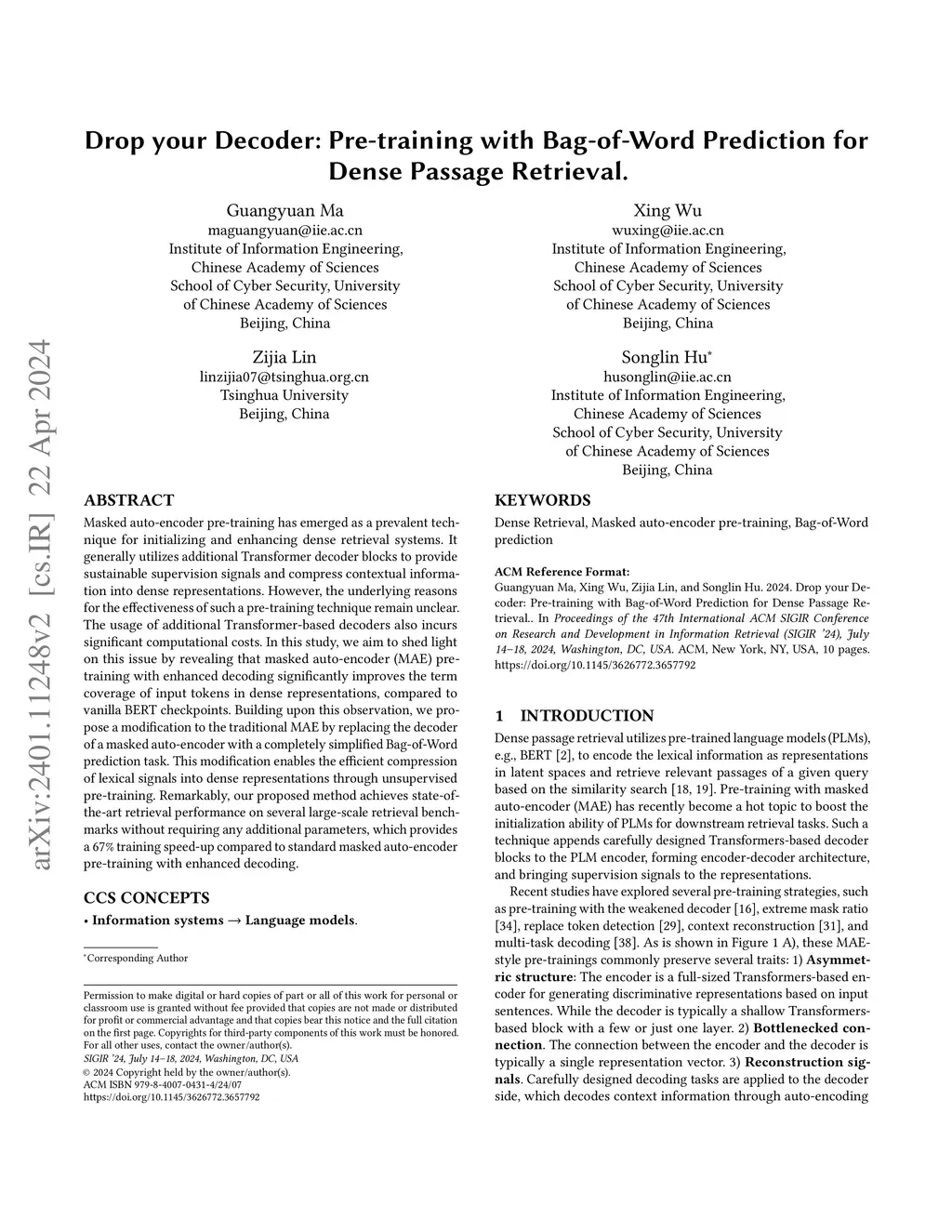 Drop your Decoder: Pre-training with Bag-of-Word Prediction for Dense Passage Retrieval