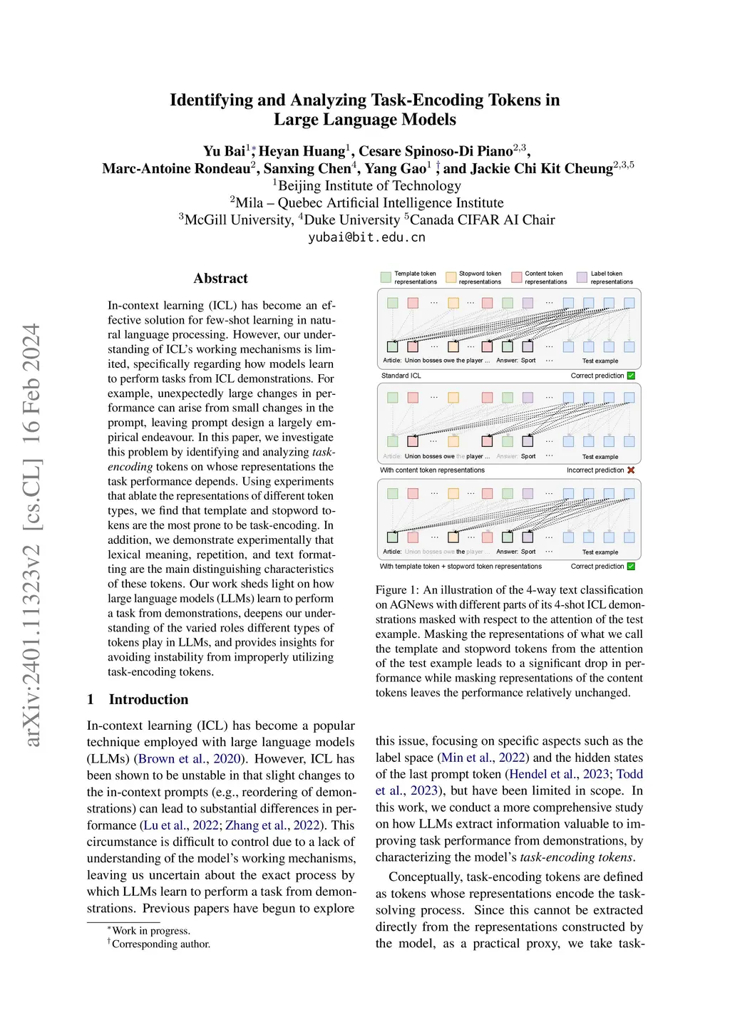 In-context learning (ICL) has emerged as an effective solution for few-shot learning with large language models (LLMs). However, how LLMs leverage demonstrations to specify a task and learn a corresponding computational function through ICL is underexplored. Drawing from the way humans learn from content-label mappings in demonstrations, we categorize the tokens in an ICL prompt into content, stopword, and template tokens. Our goal is to identify the types of tokens whose representations directly influence LLM's performance, a property we refer to as being performance-critical. By ablating representations from the attention of the test example, we find that the representations of informative content tokens have less influence on performance compared to template and stopword tokens, which contrasts with the human attention to informative words. We give evidence that the representations of performance-critical tokens aggregate information from the content tokens. Moreover, we demonstrate experimentally that lexical meaning, repetition, and structural cues are the main distinguishing characteristics of these tokens. Our work sheds light on how large language models learn to perform tasks from demonstrations and deepens our understanding of the roles different types of tokens play in large language models.