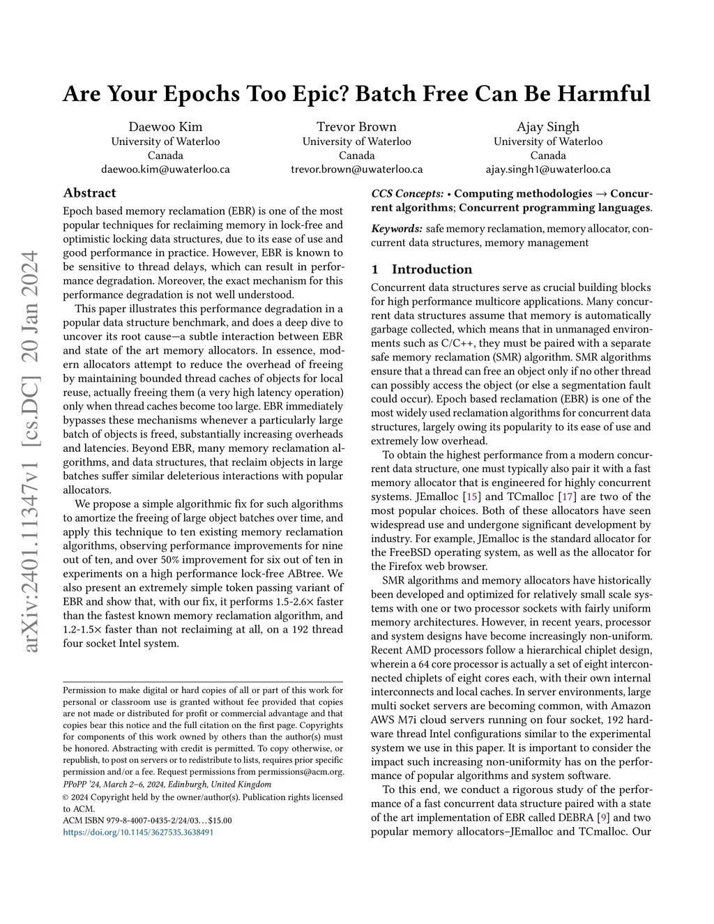 Epoch based memory reclamation (EBR) is one of the most popular techniques for reclaiming memory in lock-free and optimistic locking data structures, due to its ease of use and good performance in practice. However, EBR is known to be sensitive to thread delays, which can result in performance degradation. Moreover, the exact mechanism for this performance degradation is not well understood. This paper illustrates this performance degradation in a popular data structure benchmark, and does a deep dive to uncover its root cause-a subtle interaction between EBR and state of the art memory allocators. In essence, modern allocators attempt to reduce the overhead of freeing by maintaining bounded thread caches of objects for local reuse, actually freeing them (a very high latency operation) only when thread caches become too large. EBR immediately bypasses these mechanisms whenever a particularly large batch of objects is freed, substantially increasing overheads and latencies. Beyond EBR, many memory reclamation algorithms, and data structures, that reclaim objects in large batches suffer similar deleterious interactions with popular allocators. We propose a simple algorithmic fix for such algorithms to amortize the freeing of large object batches over time, and apply this technique to ten existing memory reclamation algorithms, observing performance improvements for nine out of ten, and over 50% improvement for six out of ten in experiments on a high performance lock-free ABtree. We also present an extremely simple token passing variant of EBR and show that, with our fix, it performs 1.5-2.6x faster than the fastest known memory reclamation algorithm, and 1.2-1.5x faster than not reclaiming at all, on a 192 thread four socket Intel system.