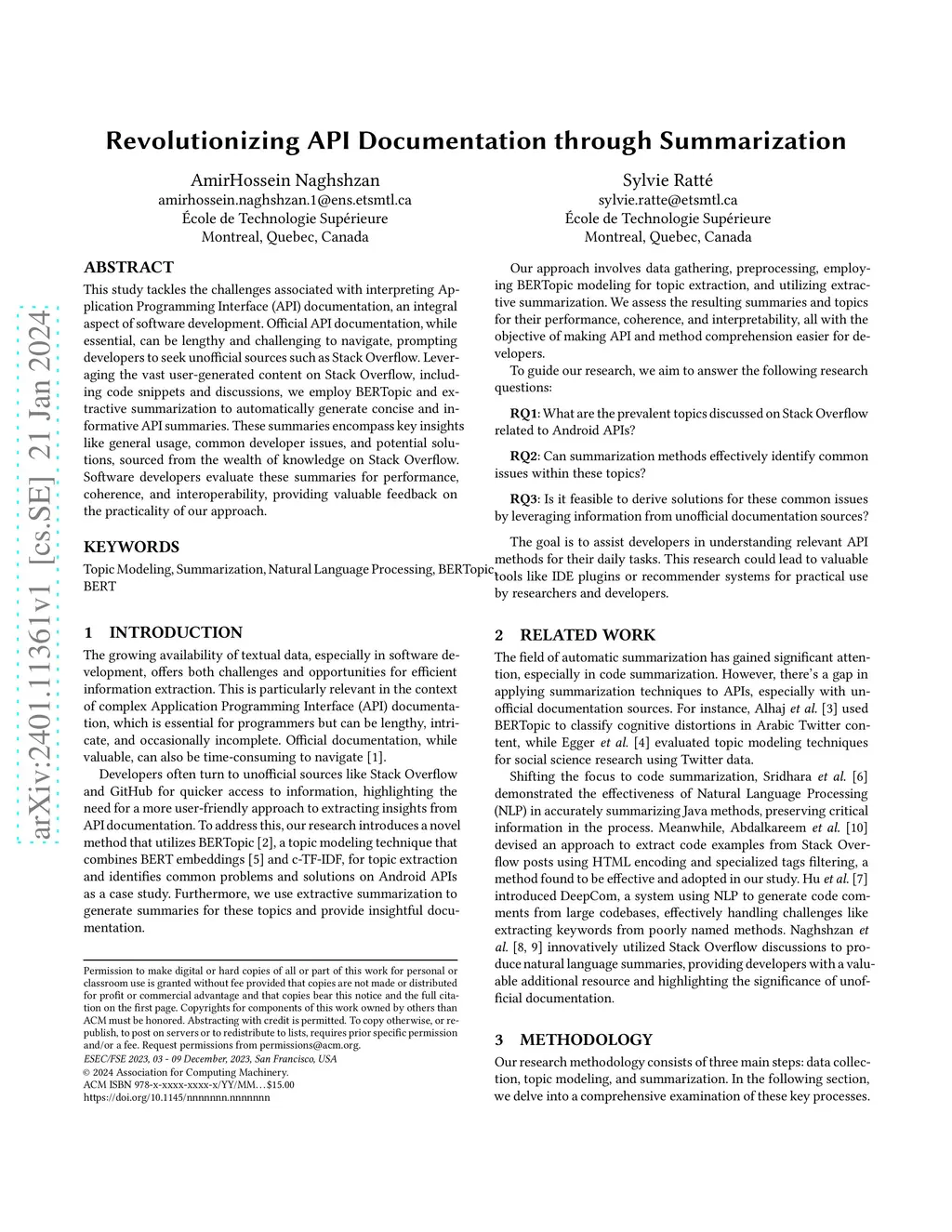 This study tackles the challenges associated with interpreting Application Programming Interface (API) documentation, an integral aspect of software development. Official API documentation, while essential, can be lengthy and challenging to navigate, prompting developers to seek unofficial sources such as Stack Overflow. Leveraging the vast user-generated content on Stack Overflow, including code snippets and discussions, we employ BERTopic and extractive summarization to automatically generate concise and informative API summaries. These summaries encompass key insights like general usage, common developer issues, and potential solutions, sourced from the wealth of knowledge on Stack Overflow. Software developers evaluate these summaries for performance, coherence, and interoperability, providing valuable feedback on the practicality of our approach.