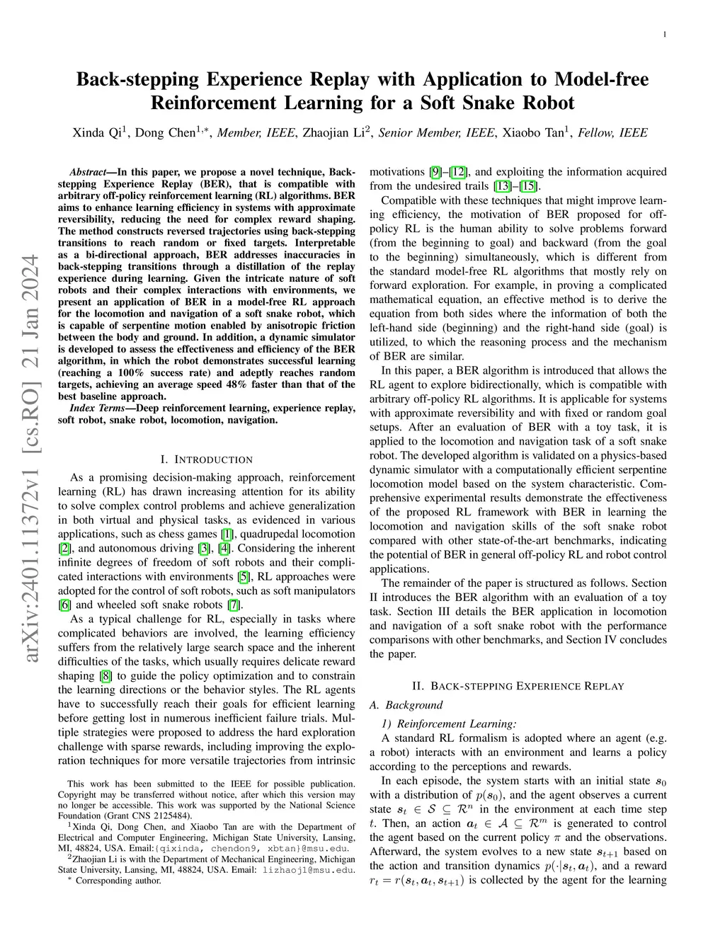 In this paper, we propose a novel technique, Back-stepping Experience Replay (BER), that is compatible with arbitrary off-policy reinforcement learning (RL) algorithms. BER aims to enhance learning efficiency in systems with approximate reversibility, reducing the need for complex reward shaping. The method constructs reversed trajectories using back-stepping transitions to reach random or fixed targets. Interpretable as a bi-directional approach, BER addresses inaccuracies in back-stepping transitions through a distillation of the replay experience during learning. Given the intricate nature of soft robots and their complex interactions with environments, we present an application of BER in a model-free RL approach for the locomotion and navigation of a soft snake robot, which is capable of serpentine motion enabled by anisotropic friction between the body and ground. In addition, a dynamic simulator is developed to assess the effectiveness and efficiency of the BER algorithm, in which the robot demonstrates successful learning (reaching a 100% success rate) and adeptly reaches random targets, achieving an average speed 48% faster than that of the best baseline approach.