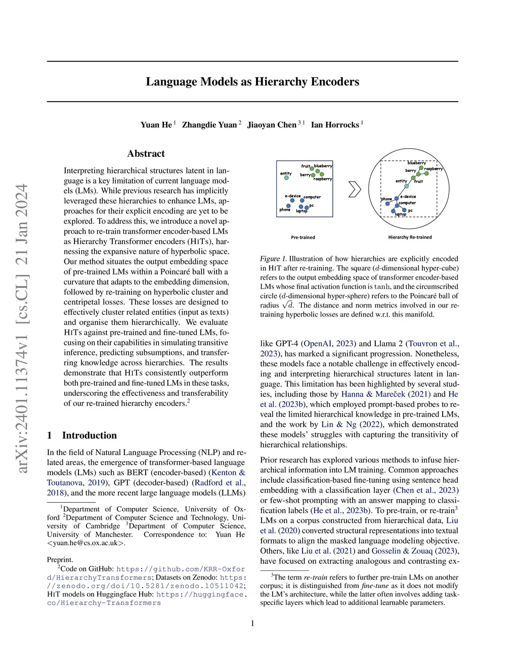 Interpreting hierarchical structures latent in language is a key limitation of current language models (LMs). While previous research has implicitly leveraged these hierarchies to enhance LMs, approaches for their explicit encoding are yet to be explored. To address this, we introduce a novel approach to re-train transformer encoder-based LMs as Hierarchy Transformer encoders (HiTs), harnessing the expansive nature of hyperbolic space. Our method situates the output embedding space of pre-trained LMs within a Poincar\é ball with a curvature that adapts to the embedding dimension, followed by re-training on hyperbolic cluster and centripetal losses. These losses are designed to effectively cluster related entities (input as texts) and organise them hierarchically. We evaluate HiTs against pre-trained and fine-tuned LMs, focusing on their capabilities in simulating transitive inference, predicting subsumptions, and transferring knowledge across hierarchies. The results demonstrate that HiTs consistently outperform both pre-trained and fine-tuned LMs in these tasks, underscoring the effectiveness and transferability of our re-trained hierarchy encoders.