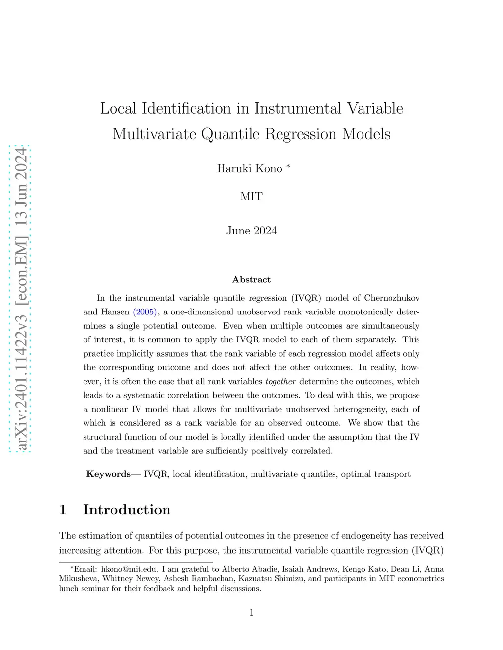 The instrumental variable (IV) quantile regression model introduced by Chernozhukov and Hansen (2005) is a useful tool for analyzing quantile treatment effects in the presence of endogeneity, but when outcome variables are multidimensional, it is silent on the joint distribution of different dimensions of each variable. To overcome this limitation, we propose an IV model built on the optimal-transport-based multivariate quantile that takes into account the correlation between the entries of the outcome variable. We then provide a local identification result for the model. Surprisingly, we find that the support size of the IV required for the identification is independent of the dimension of the outcome vector, as long as the IV is sufficiently informative. Our result follows from a general identification theorem that we establish, which has independent theoretical significance.