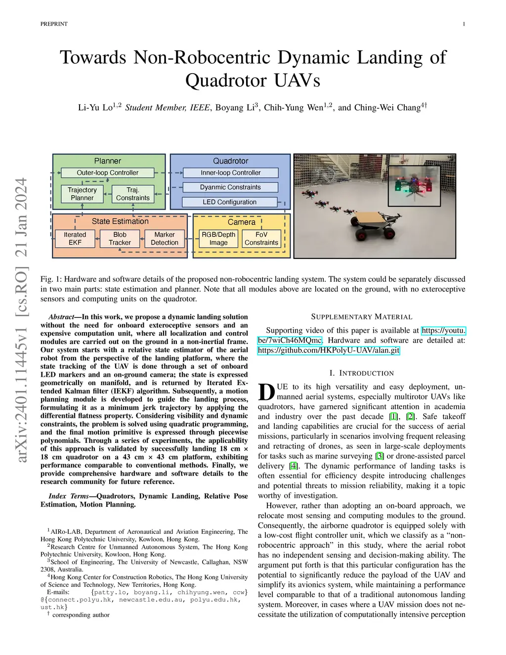 In this work, we propose a dynamic landing solution without the need for onboard exteroceptive sensors and an expensive computation unit, where all localization and control modules are carried out on the ground in a non-inertial frame. Our system starts with a relative state estimator of the aerial robot from the perspective of the landing platform, where the state tracking of the UAV is done through a set of onboard LED markers and an on-ground camera; the state is expressed geometrically on manifold, and is returned by Iterated Extended Kalman filter (IEKF) algorithm. Subsequently, a motion planning module is developed to guide the landing process, formulating it as a minimum jerk trajectory by applying the differential flatness property. Considering visibility and dynamic constraints, the problem is solved using quadratic programming, and the final motion primitive is expressed through piecewise polynomials. Through a series of experiments, the applicability of this approach is validated by successfully landing 18 cm x 18 cm quadrotor on a 43 cm x 43 cm platform, exhibiting performance comparable to conventional methods. Finally, we provide comprehensive hardware and software details to the research community for future reference.