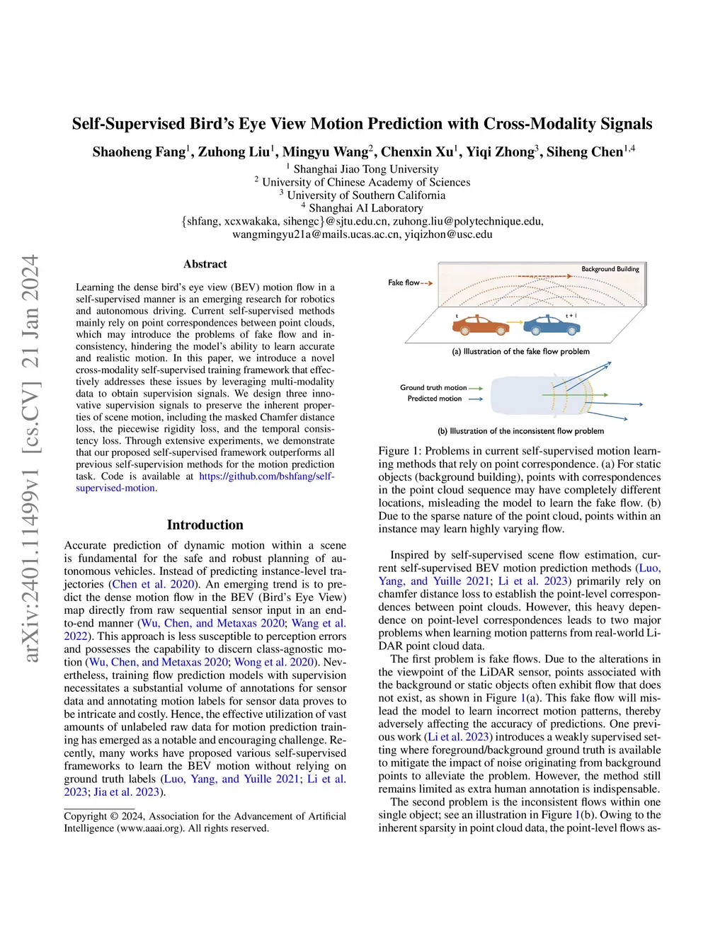 Learning the dense bird's eye view (BEV) motion flow in a self-supervised manner is an emerging research for robotics and autonomous driving. Current self-supervised methods mainly rely on point correspondences between point clouds, which may introduce the problems of fake flow and inconsistency, hindering the model's ability to learn accurate and realistic motion. In this paper, we introduce a novel cross-modality self-supervised training framework that effectively addresses these issues by leveraging multi-modality data to obtain supervision signals. We design three innovative supervision signals to preserve the inherent properties of scene motion, including the masked Chamfer distance loss, the piecewise rigidity loss, and the temporal consistency loss. Through extensive experiments, we demonstrate that our proposed self-supervised framework outperforms all previous self-supervision methods for the motion prediction task.