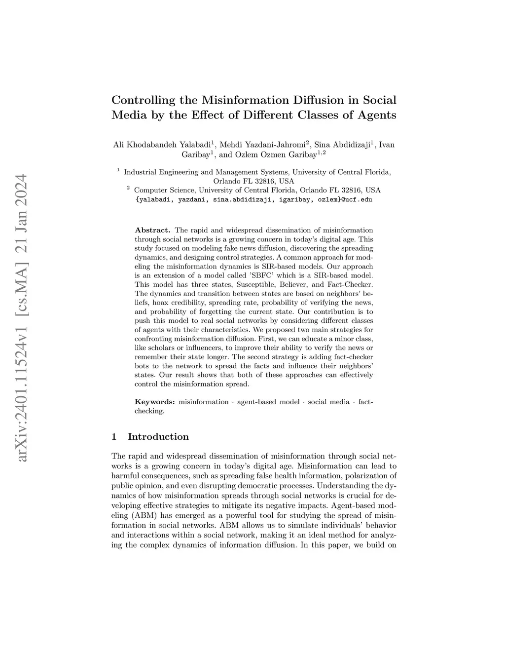 The rapid and widespread dissemination of misinformation through social networks is a growing concern in today's digital age. This study focused on modeling fake news diffusion, discovering the spreading dynamics, and designing control strategies. A common approach for modeling the misinformation dynamics is SIR-based models. Our approach is an extension of a model called 'SBFC' which is a SIR-based model. This model has three states, Susceptible, Believer, and Fact-Checker. The dynamics and transition between states are based on neighbors' beliefs, hoax credibility, spreading rate, probability of verifying the news, and probability of forgetting the current state. Our contribution is to push this model to real social networks by considering different classes of agents with their characteristics. We proposed two main strategies for confronting misinformation diffusion. First, we can educate a minor class, like scholars or influencers, to improve their ability to verify the news or remember their state longer. The second strategy is adding fact-checker bots to the network to spread the facts and influence their neighbors' states. Our result shows that both of these approaches can effectively control the misinformation spread.