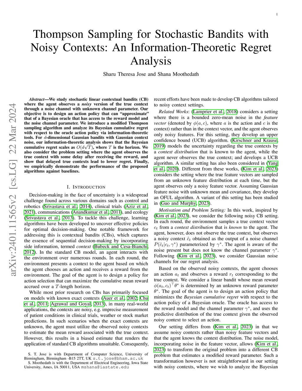 Thompson Sampling for Stochastic Bandits with Noisy Contexts: An
