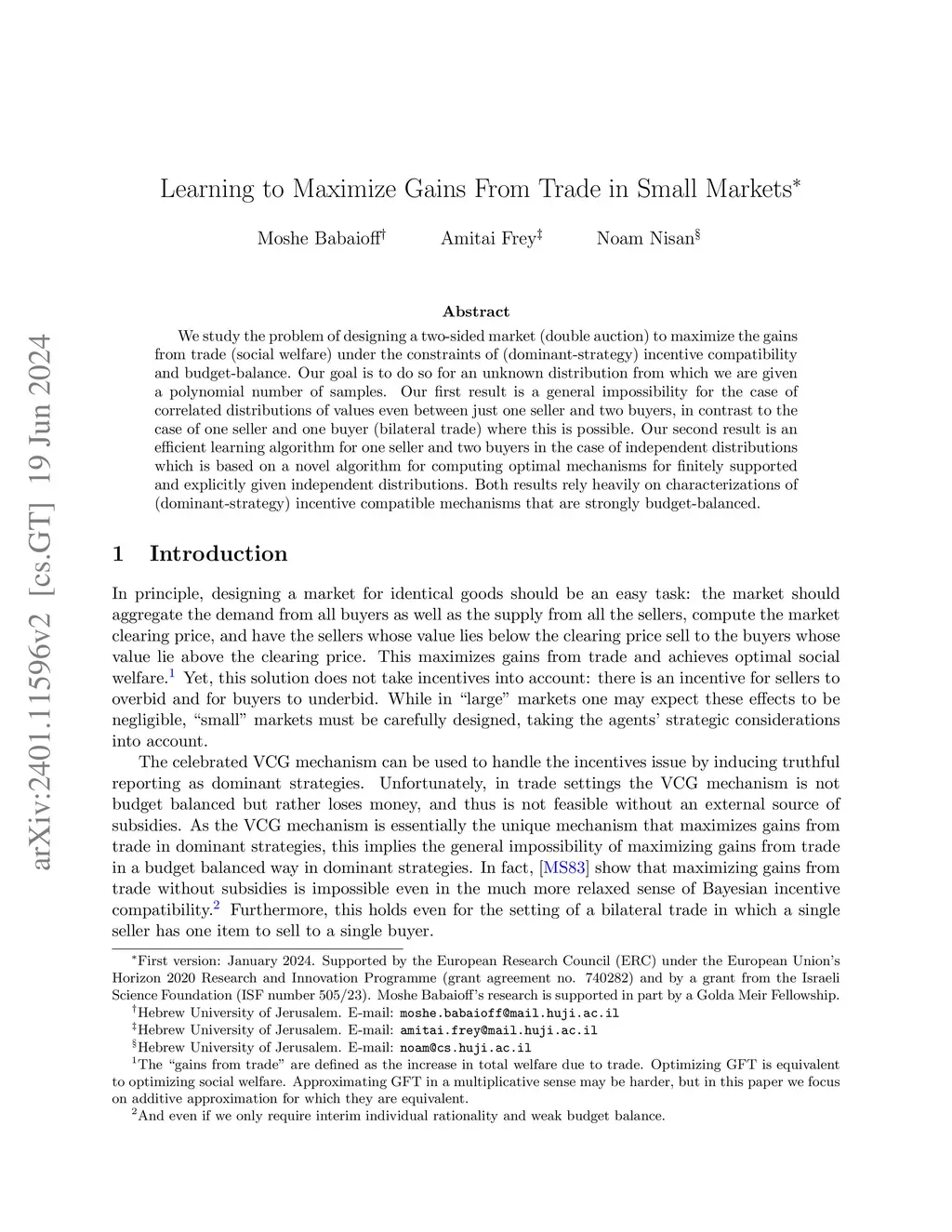 We study the problem of designing a two-sided market (double auction) to maximize the gains from trade (social welfare) under the constraints of (dominant-strategy) incentive compatibility and budget-balance. Our goal is to do so for an unknown distribution from which we are given a polynomial number of samples. Our first result is a general impossibility for the case of correlated distributions of values even between just one seller and two buyers, in contrast to the case of one seller and one buyer (bilateral trade) where this is possible. Our second result is an efficient learning algorithm for one seller and two buyers in the case of independent distributions which is based on a novel algorithm for computing optimal mechanisms for finitely supported and explicitly given independent distributions. Both results rely heavily on characterizations of (dominant-strategy) incentive compatible mechanisms that are strongly budget-balanced.