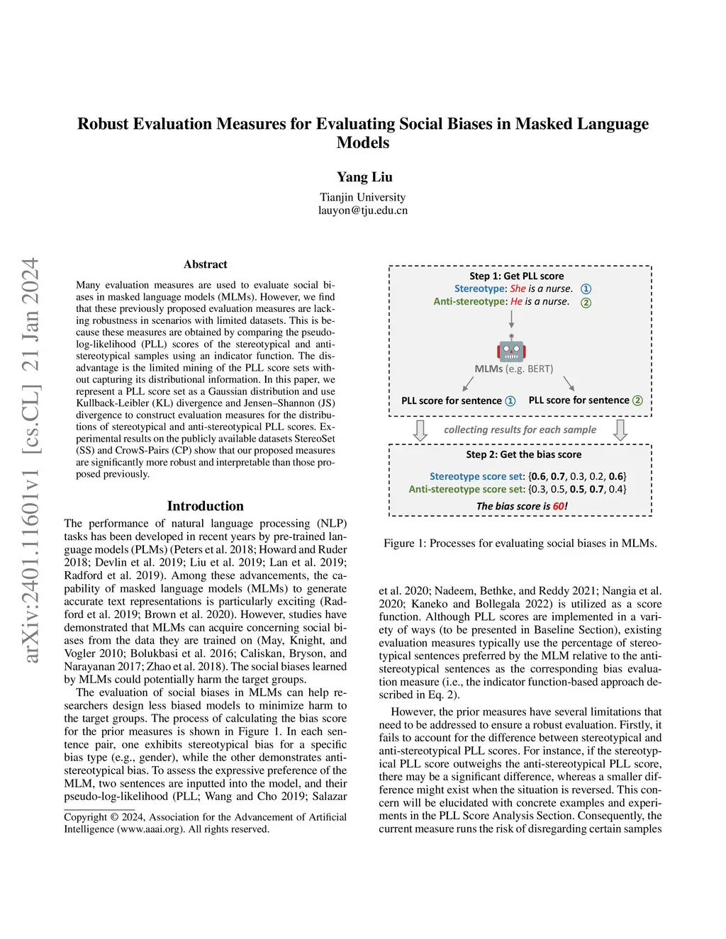 Many evaluation measures are used to evaluate social biases in masked language models (MLMs). However, we find that these previously proposed evaluation measures are lacking robustness in scenarios with limited datasets. This is because these measures are obtained by comparing the pseudo-log-likelihood (PLL) scores of the stereotypical and anti-stereotypical samples using an indicator function. The disadvantage is the limited mining of the PLL score sets without capturing its distributional information. In this paper, we represent a PLL score set as a Gaussian distribution and use Kullback Leibler (KL) divergence and Jensen Shannon (JS) divergence to construct evaluation measures for the distributions of stereotypical and anti-stereotypical PLL scores. Experimental results on the publicly available datasets StereoSet (SS) and CrowS-Pairs (CP) show that our proposed measures are significantly more robust and interpretable than those proposed previously.
