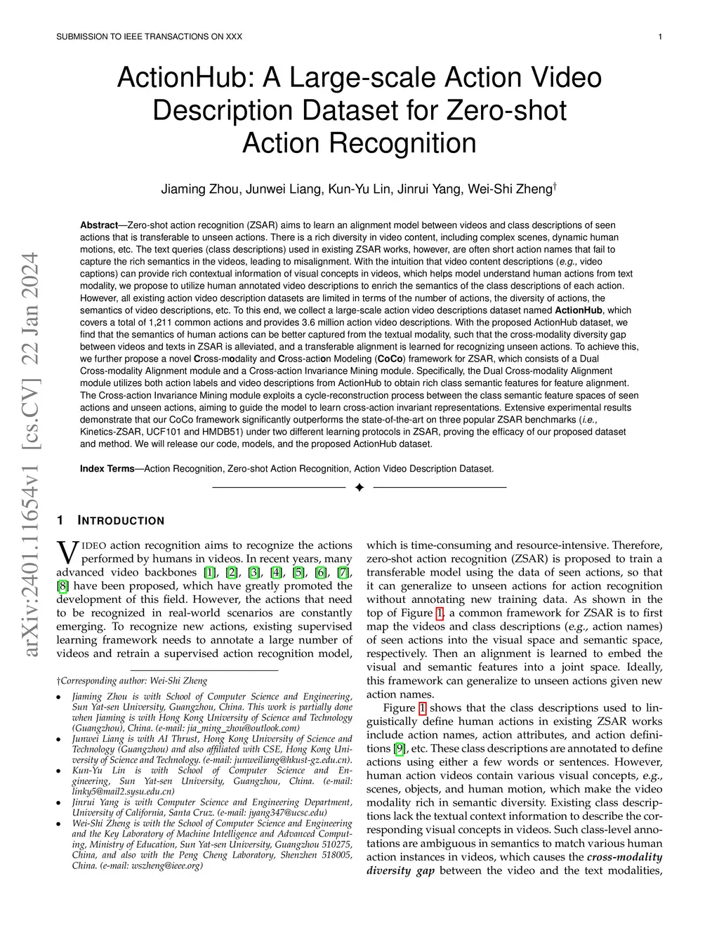Zero-shot action recognition (ZSAR) aims to learn an alignment model between videos and class descriptions of seen actions that is transferable to unseen actions. The text queries (class descriptions) used in existing ZSAR works, however, are often short action names that fail to capture the rich semantics in the videos, leading to misalignment. With the intuition that video content descriptions (e.g., video captions) can provide rich contextual information of visual concepts in videos, we propose to utilize human annotated video descriptions to enrich the semantics of the class descriptions of each action. However, all existing action video description datasets are limited in terms of the number of actions, the semantics of video descriptions, etc. To this end, we collect a large-scale action video descriptions dataset named ActionHub, which covers a total of 1,211 common actions and provides 3.6 million action video descriptions. With the proposed ActionHub dataset, we further propose a novel Cross-modality and Cross-action Modeling (CoCo) framework for ZSAR, which consists of a Dual Cross-modality Alignment module and a Cross-action Invariance Mining module. Specifically, the Dual Cross-modality Alignment module utilizes both action labels and video descriptions from ActionHub to obtain rich class semantic features for feature alignment. The Cross-action Invariance Mining module exploits a cycle-reconstruction process between the class semantic feature spaces of seen actions and unseen actions, aiming to guide the model to learn cross-action invariant representations. Extensive experimental results demonstrate that our CoCo framework significantly outperforms the state-of-the-art on three popular ZSAR benchmarks (i.e., Kinetics-ZSAR, UCF101 and HMDB51) under two different learning protocols in ZSAR. We will release our code, models, and the proposed ActionHub dataset.