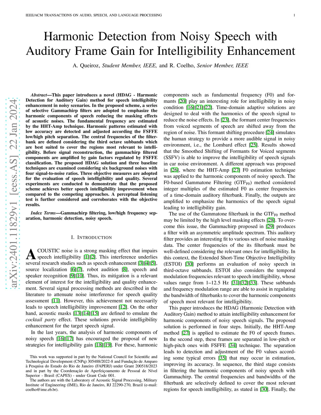 This paper introduces a novel (HDAG - Harmonic Detection for Auditory Gain) method for speech intelligibility enhancement in noisy scenarios. In the proposed scheme, a series of selective Gammachirp filters are adopted to emphasize the harmonic components of speech reducing the masking effects of acoustic noises. The fundamental frequency are estimated by the HHT-Amp technique. Harmonic patterns estimated with low accuracy are detected and adjusted according the FSFFE low/high pitch separation. The central frequencies of the filterbank are defined considering the third octave subbands which are best suited to cover the regions most relevant to intelligibility. Before signal reconstruction, the gammachirp filtered components are amplified by gain factors regulated by FSFFE classification. The proposed HDAG solution and three baseline techniques are examined considering six background noises with four signal-to-noise ratios. Three objective measures are adopted for the evaluation of speech intelligibility and quality. Several experiments are conducted to demonstrate that the proposed scheme achieves better speech intelligibility improvement when compared to the competing approaches. A perceptual listening test is further considered and corroborates with the objective results.