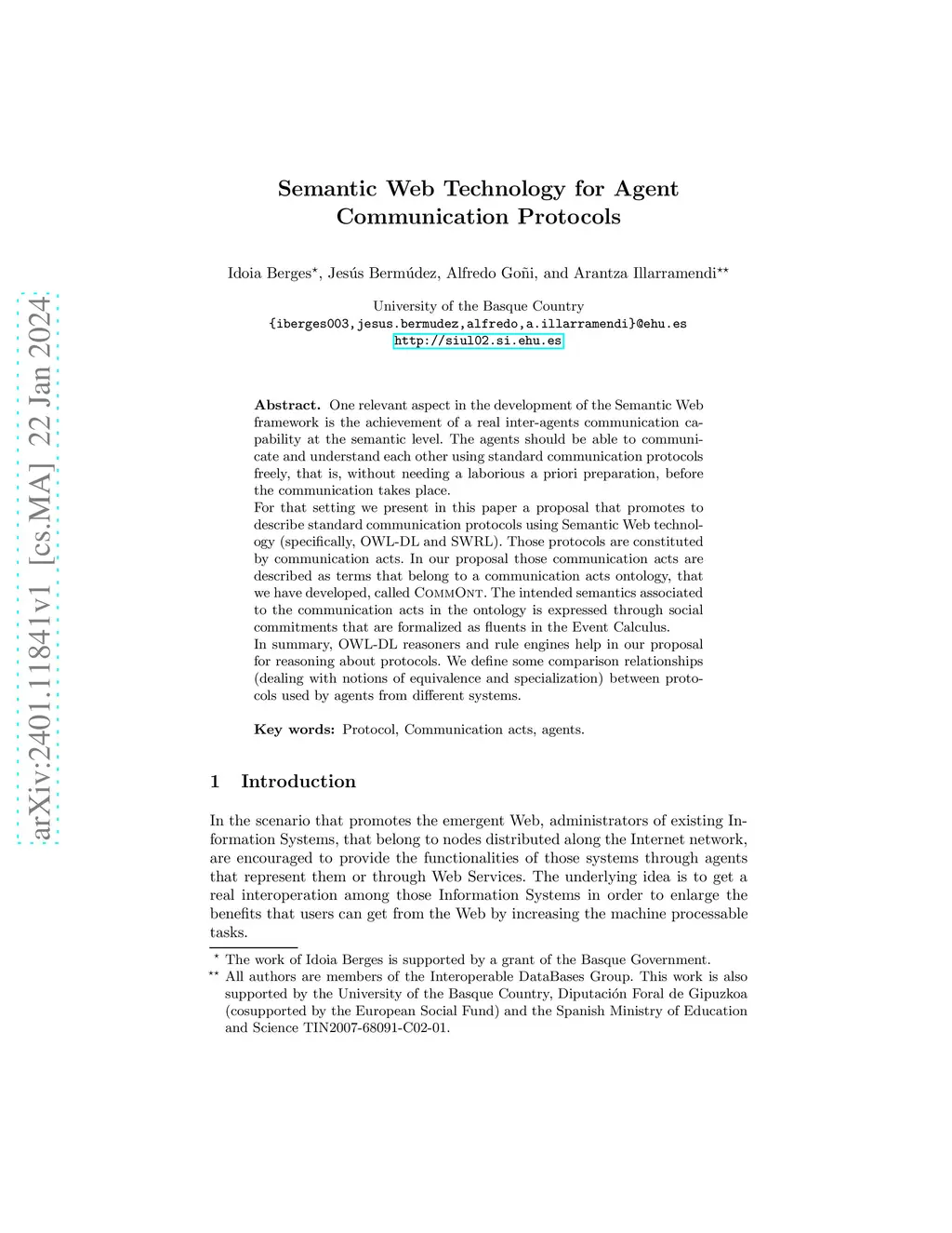 One relevant aspect in the development of the Semantic Web framework is the achievement of a real inter-agents communication capability at the semantic level. The agents should be able to communicate and understand each other using standard communication protocols freely, that is, without needing a laborious a priori preparation, before the communication takes place. For that setting we present in this paper a proposal that promotes to describe standard communication protocols using Semantic Web technology (specifically, OWL-DL and SWRL). Those protocols are constituted by communication acts. In our proposal those communication acts are described as terms that belong to a communication acts ontology, that we have developed, called CommOnt. The intended semantics associated to the communication acts in the ontology is expressed through social commitments that are formalized as fluents in the Event Calculus. In summary, OWL-DL reasoners and rule engines help in our proposal for reasoning about protocols. We define some comparison relationships (dealing with notions of equivalence and specialization) between protocols used by agents from different systems.
