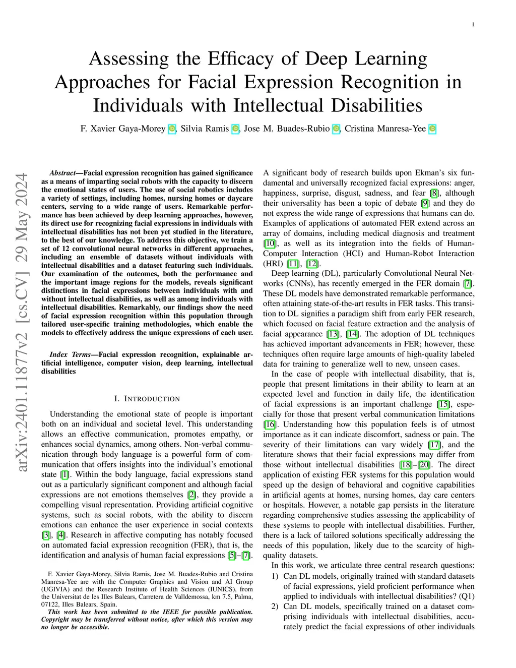 Facial expression recognition has gained significance as a means of imparting social robots with the capacity to discern the emotional states of users. The use of social robotics includes a variety of settings, including homes, nursing homes or daycare centers, serving to a wide range of users. Remarkable performance has been achieved by deep learning approaches, however, its direct use for recognizing facial expressions in individuals with intellectual disabilities has not been yet studied in the literature, to the best of our knowledge. To address this objective, we train a set of 12 convolutional neural networks in different approaches, including an ensemble of datasets without individuals with intellectual disabilities and a dataset featuring such individuals. Our examination of the outcomes, both the performance and the important image regions for the models, reveals significant distinctions in facial expressions between individuals with and without intellectual disabilities, as well as among individuals with intellectual disabilities. Remarkably, our findings show the need of facial expression recognition within this population through tailored user-specific training methodologies, which enable the models to effectively address the unique expressions of each user.