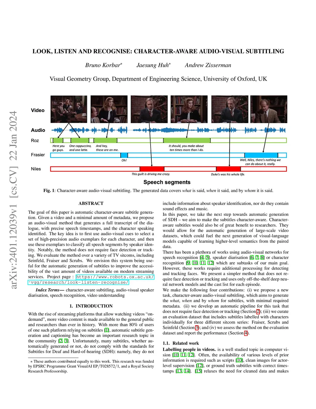 The goal of this paper is automatic character-aware subtitle generation. Given a video and a minimal amount of metadata, we propose an audio-visual method that generates a full transcript of the dialogue, with precise speech timestamps, and the character speaking identified. The key idea is to first use audio-visual cues to select a set of high-precision audio exemplars for each character, and then use these exemplars to classify all speech segments by speaker identity. Notably, the method does not require face detection or tracking. We evaluate the method over a variety of TV sitcoms, including Seinfeld, Fraiser and Scrubs. We envision this system being useful for the automatic generation of subtitles to improve the accessibility of the vast amount of videos available on modern streaming services. Project page : \url{https://www.robots.ox.ac.uk/~vgg/research/look-listen-recognise/}