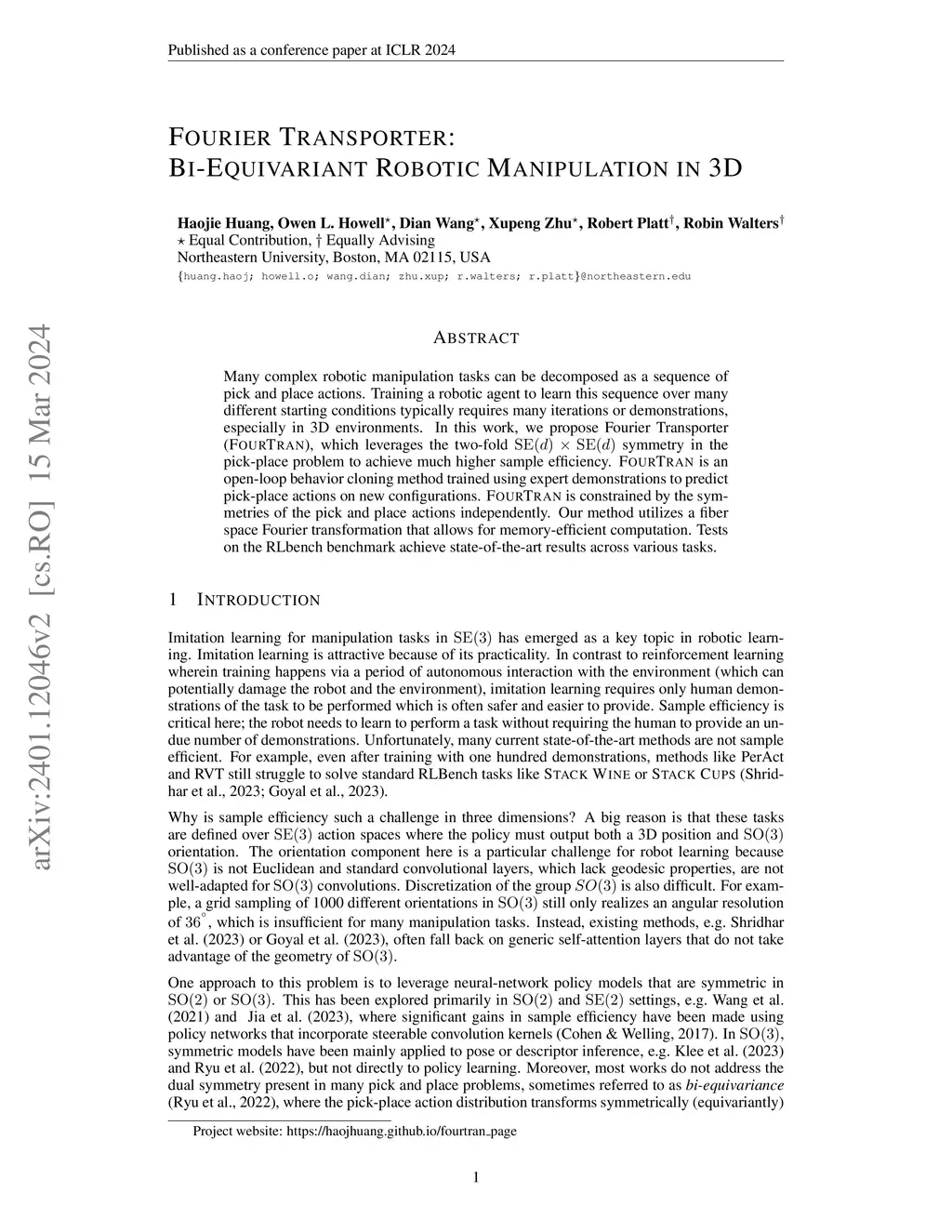 Many complex robotic manipulation tasks can be decomposed as a sequence of pick and place actions. Training a robotic agent to learn this sequence over many different starting conditions typically requires many iterations or demonstrations, especially in 3D environments. In this work, we propose Fourier Transporter (FourTran) which leverages the two-fold SE(d)xSE(d) symmetry in the pick-place problem to achieve much higher sample efficiency. FourTran is an open-loop behavior cloning method trained using expert demonstrations to predict pick-place actions on new environments. FourTran is constrained to incorporate symmetries of the pick and place actions independently. Our method utilizes a fiber space Fourier transformation that allows for memory-efficient construction. We test our proposed network on the RLbench benchmark and achieve state-of-the-art results across various tasks.