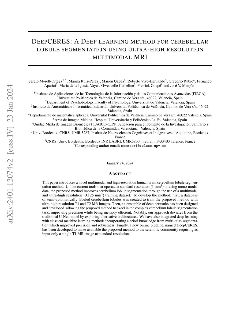 This paper introduces a novel multimodal and high-resolution human brain cerebellum lobule segmentation method. Unlike current tools that operate at standard resolution () or using mono-modal data, the proposed method improves cerebellum lobule segmentation through the use of a multimodal and ultra-high resolution () training dataset. To develop the method, first, a database of semi-automatically labelled cerebellum lobules was created to train the proposed method with ultra-high resolution T1 and T2 MR images. Then, an ensemble of deep networks has been designed and developed, allowing the proposed method to excel in the complex cerebellum lobule segmentation task, improving precision while being memory efficient. Notably, our approach deviates from the traditional U-Net model by exploring alternative architectures. We have also integrated deep learning with classical machine learning methods incorporating a priori knowledge from multi-atlas segmentation, which improved precision and robustness. Finally, a new online pipeline, named DeepCERES, has been developed to make available the proposed method to the scientific community requiring as input only a single T1 MR image at standard resolution.