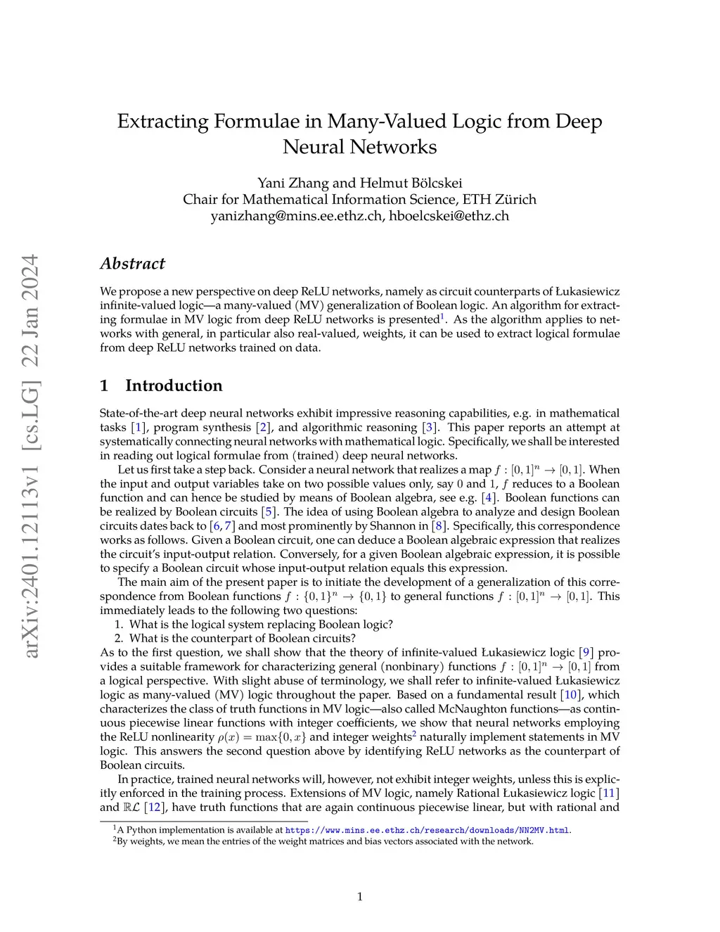 We propose a new perspective on deep ReLU networks, namely as circuit counterparts of Lukasiewicz infinite-valued logic -- a many-valued (MV) generalization of Boolean logic. An algorithm for extracting formulae in MV logic from deep ReLU networks is presented. As the algorithm applies to networks with general, in particular also real-valued, weights, it can be used to extract logical formulae from deep ReLU networks trained on data.