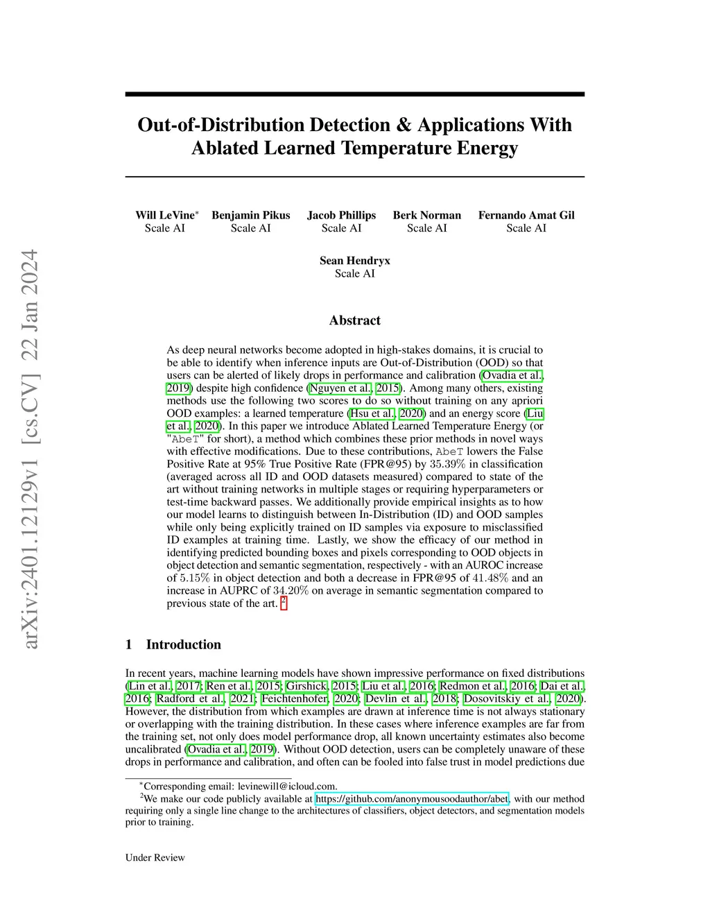 As deep neural networks become adopted in high-stakes domains, it is crucial to be able to identify when inference inputs are Out-of-Distribution (OOD) so that users can be alerted of likely drops in performance and calibration despite high confidence. Among many others, existing methods use the following two scores to do so without training on any apriori OOD examples: a learned temperature and an energy score. In this paper we introduce Ablated Learned Temperature Energy (or "AbeT" for short), a method which combines these prior methods in novel ways with effective modifications. Due to these contributions, AbeT lowers the False Positive Rate at True Positive Rate (FPR@95) by in classification (averaged across all ID and OOD datasets measured) compared to state of the art without training networks in multiple stages or requiring hyperparameters or test-time backward passes. We additionally provide empirical insights as to how our model learns to distinguish between In-Distribution (ID) and OOD samples while only being explicitly trained on ID samples via exposure to misclassified ID examples at training time. Lastly, we show the efficacy of our method in identifying predicted bounding boxes and pixels corresponding to OOD objects in object detection and semantic segmentation, respectively - with an AUROC increase of in object detection and both a decrease in FPR@95 of and an increase in AUPRC of on average in semantic segmentation compared to previous state of the art.