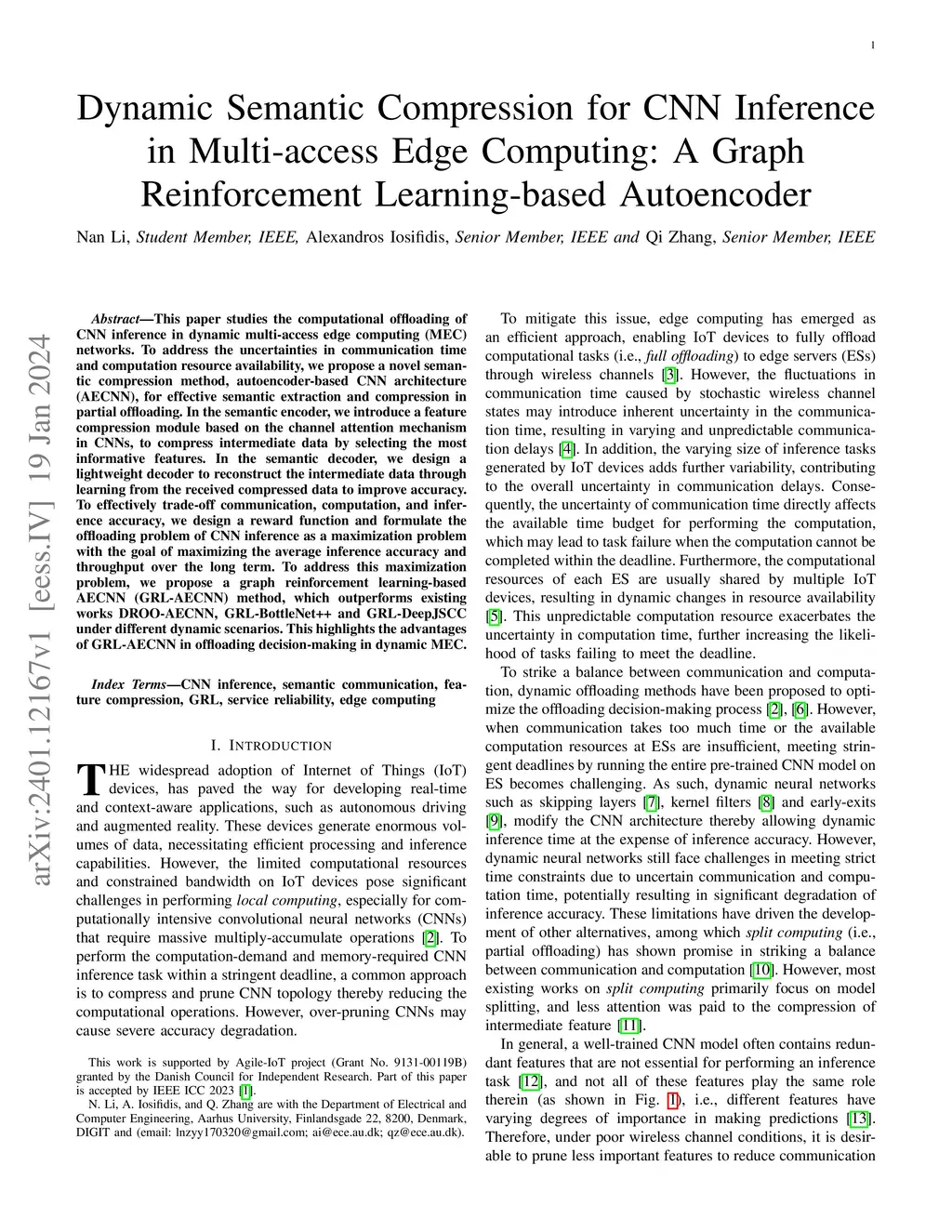 This paper studies the computational offloading of CNN inference in dynamic multi-access edge computing (MEC) networks. To address the uncertainties in communication time and computation resource availability, we propose a novel semantic compression method, autoencoder-based CNN architecture (AECNN), for effective semantic extraction and compression in partial offloading. In the semantic encoder, we introduce a feature compression module based on the channel attention mechanism in CNNs, to compress intermediate data by selecting the most informative features. In the semantic decoder, we design a lightweight decoder to reconstruct the intermediate data through learning from the received compressed data to improve accuracy. To effectively trade-off communication, computation, and inference accuracy, we design a reward function and formulate the offloading problem of CNN inference as a maximization problem with the goal of maximizing the average inference accuracy and throughput over the long term. To address this maximization problem, we propose a graph reinforcement learning-based AECNN (GRL-AECNN) method, which outperforms existing works DROO-AECNN, GRL-BottleNet++ and GRL-DeepJSCC under different dynamic scenarios. This highlights the advantages of GRL-AECNN in offloading decision-making in dynamic MEC.