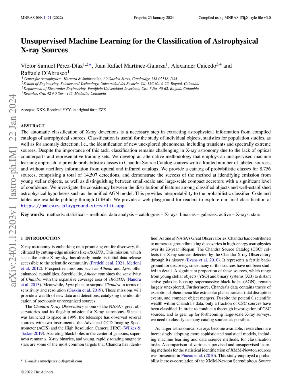 The automatic classification of X-ray detections is a necessary step in extracting astrophysical information from compiled catalogs of astrophysical sources. Classification is useful for the study of individual objects, statistics for population studies, as well as for anomaly detection, i.e., the identification of new unexplored phenomena, including transients and spectrally extreme sources. Despite the importance of this task, classification remains challenging in X-ray astronomy due to the lack of optical counterparts and representative training sets. We develop an alternative methodology that employs an unsupervised machine learning approach to provide probabilistic classes to Chandra Source Catalog sources with a limited number of labeled sources, and without ancillary information from optical and infrared catalogs. We provide a catalog of probabilistic classes for 8,756 sources, comprising a total of 14,507 detections, and demonstrate the success of the method at identifying emission from young stellar objects, as well as distinguishing between small-scale and large-scale compact accretors with a significant level of confidence. We investigate the consistency between the distribution of features among classified objects and well-established astrophysical hypotheses such as the unified AGN model. This provides interpretability to the probabilistic classifier. Code and tables are available publicly through GitHub. We provide a web playground for readers to explore our final classification at https://umlcaxs-playground.streamlit.app.