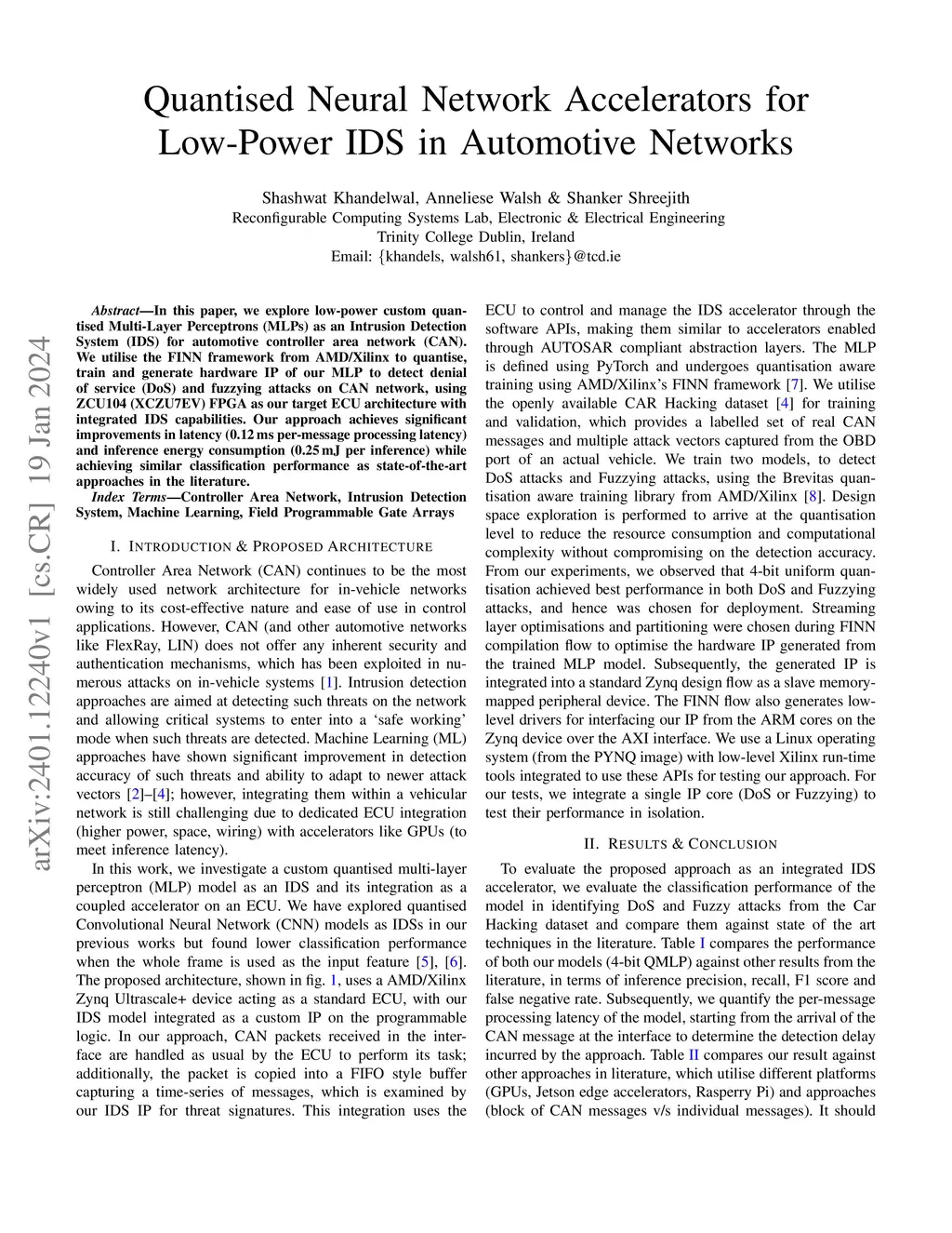In this paper, we explore low-power custom quantised Multi-Layer Perceptrons (MLPs) as an Intrusion Detection System (IDS) for automotive controller area network (CAN). We utilise the FINN framework from AMD/Xilinx to quantise, train and generate hardware IP of our MLP to detect denial of service (DoS) and fuzzying attacks on CAN network, using ZCU104 (XCZU7EV) FPGA as our target ECU architecture with integrated IDS capabilities. Our approach achieves significant improvements in latency (0.12 ms per-message processing latency) and inference energy consumption (0.25 mJ per inference) while achieving similar classification performance as state-of-the-art approaches in the literature.