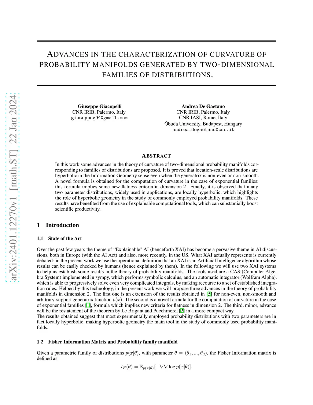 In this work some advances in the theory of curvature of two-dimensional probability manifolds corresponding to families of distributions are proposed. It is proved that location-scale distributions are hyperbolic in the Information Geometry sense even when the generatrix is non-even or non-smooth. A novel formula is obtained for the computation of curvature in the case of exponential families: this formula implies some new flatness criteria in dimension 2. Finally, it is observed that many two parameter distributions, widely used in applications, are locally hyperbolic, which highlights the role of hyperbolic geometry in the study of commonly employed probability manifolds. These results have benefited from the use of explainable computational tools, which can substantially boost scientific productivity.