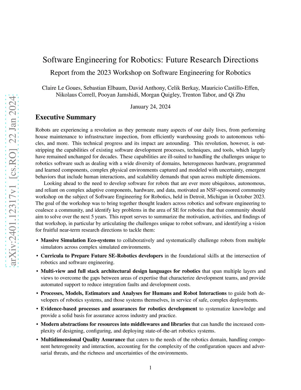 Robots are experiencing a revolution as they permeate many aspects of our daily lives, from performing house maintenance to infrastructure inspection, from efficiently warehousing goods to autonomous vehicles, and more. This technical progress and its impact are astounding. This revolution, however, is outstripping the capabilities of existing software development processes, techniques, and tools, which largely have remained unchanged for decades. These capabilities are ill-suited to handling the challenges unique to robotics software such as dealing with a wide diversity of domains, heterogeneous hardware, programmed and learned components, complex physical environments captured and modeled with uncertainty, emergent behaviors that include human interactions, and scalability demands that span across multiple dimensions. Looking ahead to the need to develop software for robots that are ever more ubiquitous, autonomous, and reliant on complex adaptive components, hardware, and data, motivated an NSF-sponsored community workshop on the subject of Software Engineering for Robotics, held in Detroit, Michigan in October 2023. The goal of the workshop was to bring together thought leaders across robotics and software engineering to coalesce a community, and identify key problems in the area of SE for robotics that that community should aim to solve over the next 5 years. This report serves to summarize the motivation, activities, and findings of that workshop, in particular by articulating the challenges unique to robot software, and identifying a vision for fruitful near-term research directions to tackle them.