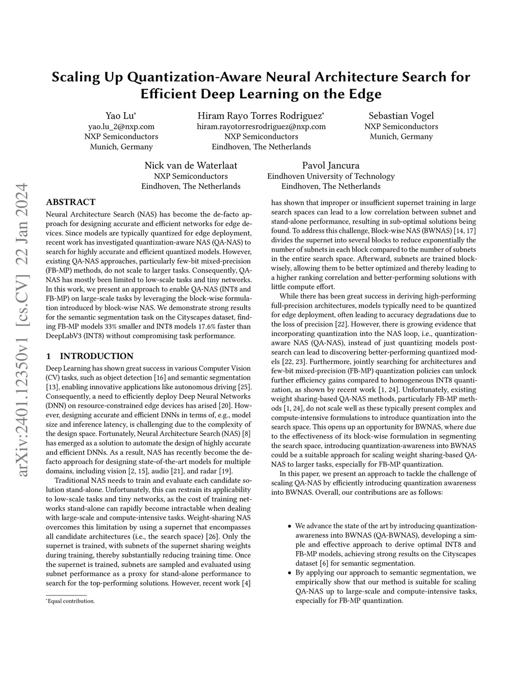 Neural Architecture Search (NAS) has become the de-facto approach for designing accurate and efficient networks for edge devices. Since models are typically quantized for edge deployment, recent work has investigated quantization-aware NAS (QA-NAS) to search for highly accurate and efficient quantized models. However, existing QA-NAS approaches, particularly few-bit mixed-precision (FB-MP) methods, do not scale to larger tasks. Consequently, QA-NAS has mostly been limited to low-scale tasks and tiny networks. In this work, we present an approach to enable QA-NAS (INT8 and FB-MP) on large-scale tasks by leveraging the block-wise formulation introduced by block-wise NAS. We demonstrate strong results for the semantic segmentation task on the Cityscapes dataset, finding FB-MP models 33% smaller and INT8 models 17.6% faster than DeepLabV3 (INT8) without compromising task performance.