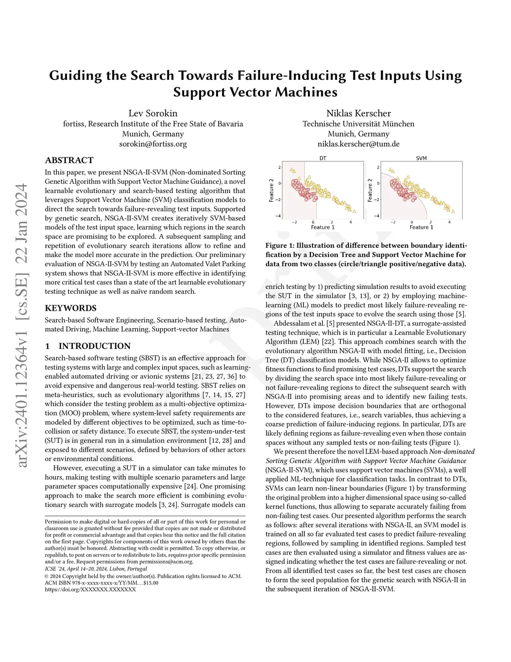 In this paper, we present NSGA-II-SVM (Non-dominated Sorting Genetic Algorithm with Support Vector Machine Guidance), a novel learnable evolutionary and search-based testing algorithm that leverages Support Vector Machine (SVM) classification models to direct the search towards failure-revealing test inputs. Supported by genetic search, NSGA-II-SVM creates iteratively SVM-based models of the test input space, learning which regions in the search space are promising to be explored. A subsequent sampling and repetition of evolutionary search iterations allow to refine and make the model more accurate in the prediction. Our preliminary evaluation of NSGA-II-SVM by testing an Automated Valet Parking system shows that NSGA-II-SVM is more effective in identifying more critical test cases than a state of the art learnable evolutionary testing technique as well as naive random search.