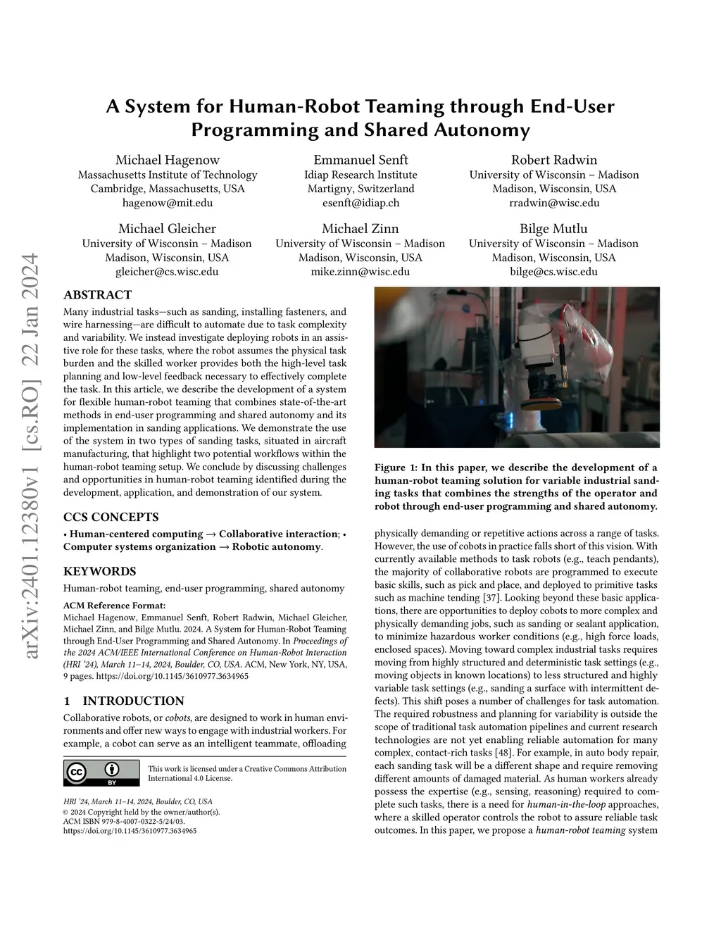 Many industrial tasks-such as sanding, installing fasteners, and wire harnessing-are difficult to automate due to task complexity and variability. We instead investigate deploying robots in an assistive role for these tasks, where the robot assumes the physical task burden and the skilled worker provides both the high-level task planning and low-level feedback necessary to effectively complete the task. In this article, we describe the development of a system for flexible human-robot teaming that combines state-of-the-art methods in end-user programming and shared autonomy and its implementation in sanding applications. We demonstrate the use of the system in two types of sanding tasks, situated in aircraft manufacturing, that highlight two potential workflows within the human-robot teaming setup. We conclude by discussing challenges and opportunities in human-robot teaming identified during the development, application, and demonstration of our system.
