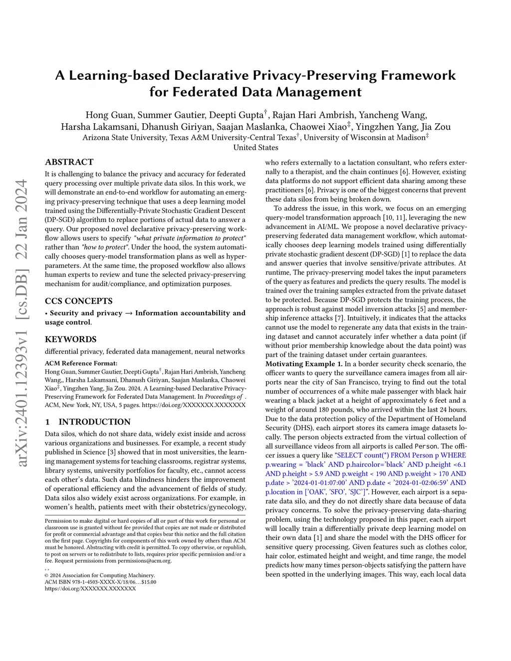 It is challenging to balance the privacy and accuracy for federated query processing over multiple private data silos. In this work, we will demonstrate an end-to-end workflow for automating an emerging privacy-preserving technique that uses a deep learning model trained using the Differentially-Private Stochastic Gradient Descent (DP-SGD) algorithm to replace portions of actual data to answer a query. Our proposed novel declarative privacy-preserving workflow allows users to specify "what private information to protect" rather than "how to protect". Under the hood, the system automatically chooses query-model transformation plans as well as hyper-parameters. At the same time, the proposed workflow also allows human experts to review and tune the selected privacy-preserving mechanism for audit/compliance, and optimization purposes.
