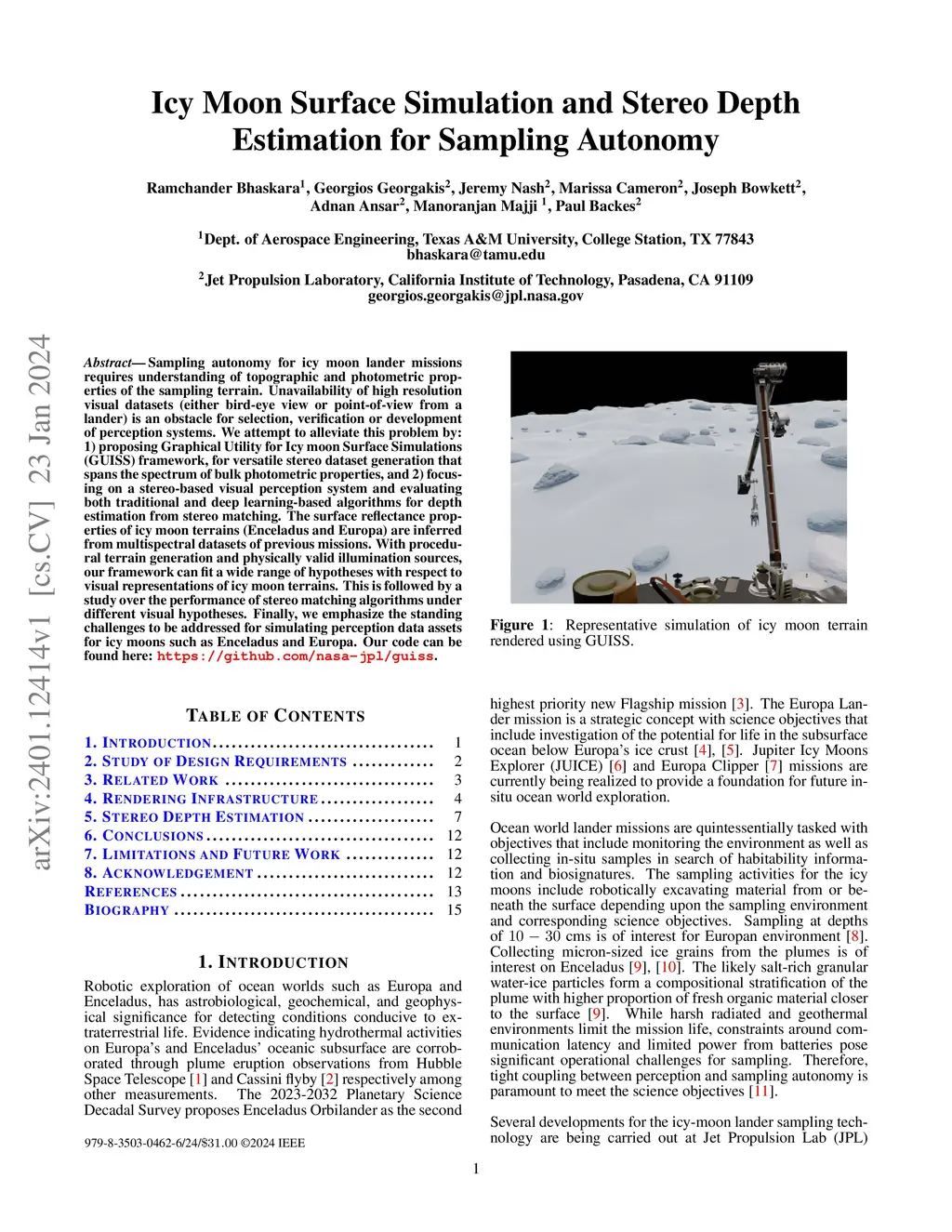 Icy Moon Surface Simulation and Stereo Depth Estimation for Sampling