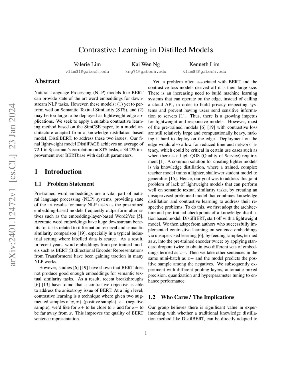 Natural Language Processing models like BERT can provide state-of-the-art word embeddings for downstream NLP tasks. However, these models yet to perform well on Semantic Textual Similarity, and may be too large to be deployed as lightweight edge applications. We seek to apply a suitable contrastive learning method based on the SimCSE paper, to a model architecture adapted from a knowledge distillation based model, DistilBERT, to address these two issues. Our final lightweight model DistilFace achieves an average of 72.1 in Spearman's correlation on STS tasks, a 34.2 percent improvement over BERT base.