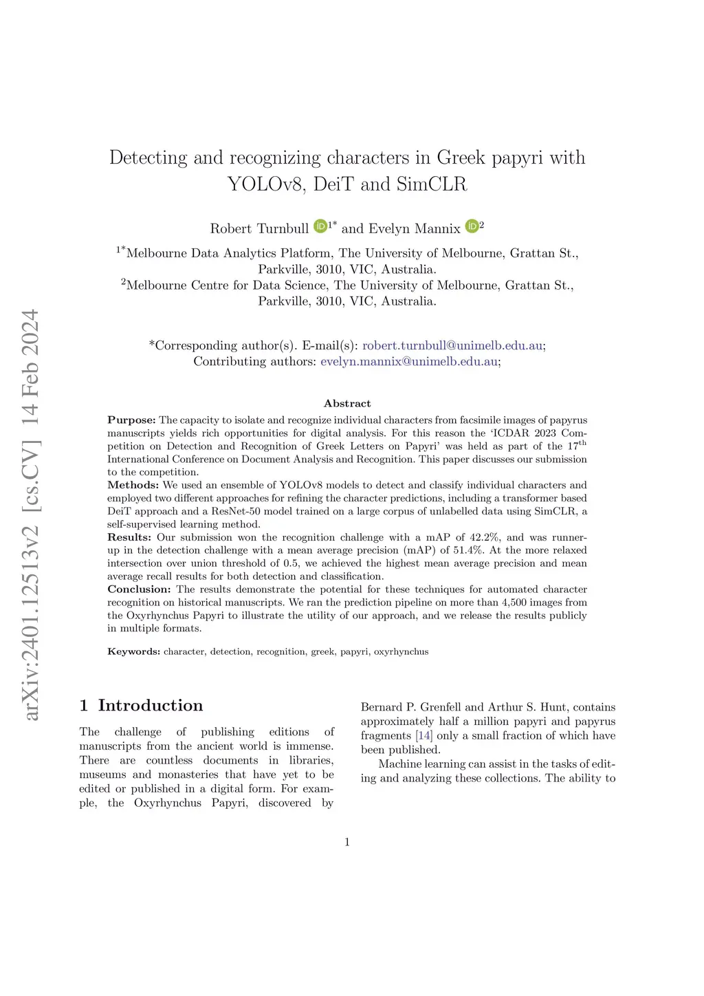 Detecting and recognizing characters in Greek papyri with YOLOv8, DeiT
