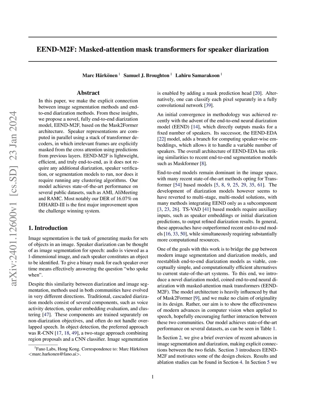 In this paper, we make the explicit connection between image segmentation methods and end-to-end diarization methods. From these insights, we propose a novel, fully end-to-end diarization model, EEND-M2F, based on the Mask2Former architecture. Speaker representations are computed in parallel using a stack of transformer decoders, in which irrelevant frames are explicitly masked from the cross attention using predictions from previous layers. EEND-M2F is lightweight, efficient, and truly end-to-end, as it does not require any additional diarization, speaker verification, or segmentation models to run, nor does it require running any clustering algorithms. Our model achieves state-of-the-art performance on several public datasets, such as AMI, AliMeeting and RAMC. Most notably our DER of 16.07% on DIHARD-III is the first major improvement upon the challenge winning system.