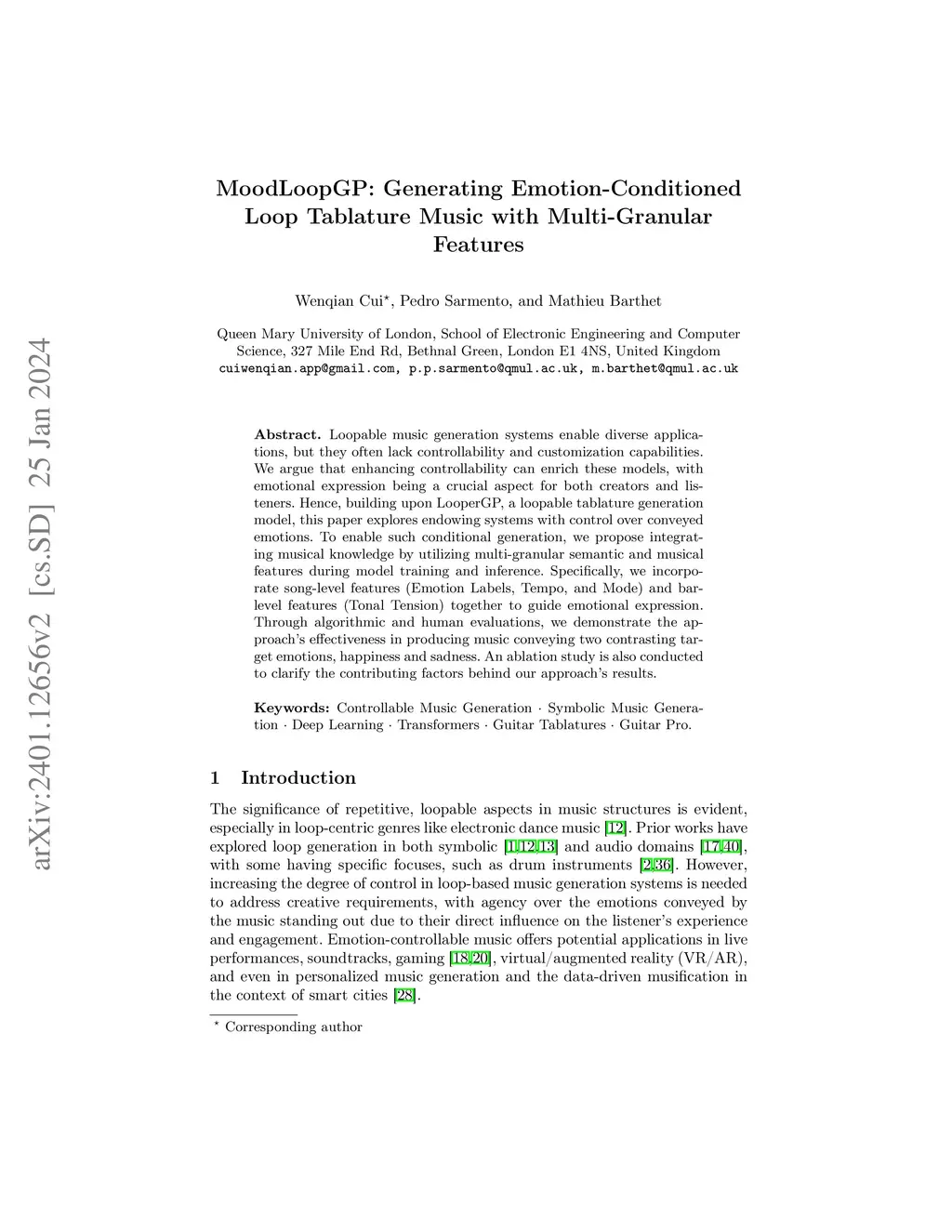 MoodLoopGP: Generating Emotion-Conditioned Loop Tablature Music with Multi-Granular Features
