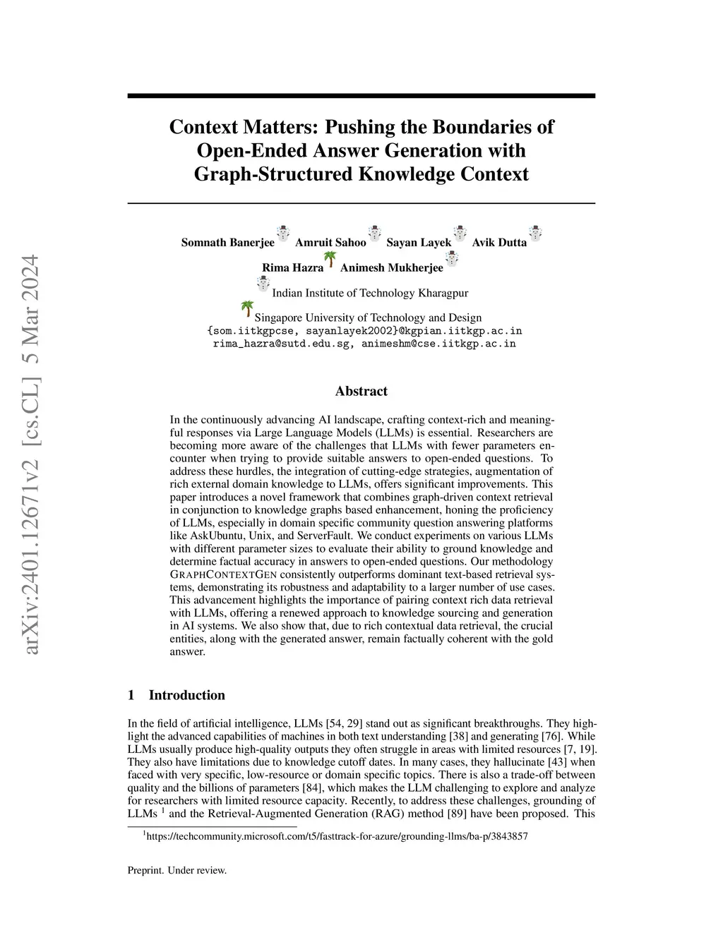 In the continuously advancing AI landscape, crafting context-rich and meaningful responses via Large Language Models (LLMs) is essential. Researchers are becoming more aware of the challenges that LLMs with fewer parameters encounter when trying to provide suitable answers to open-ended questions. To address these hurdles, the integration of cutting-edge strategies, augmentation of rich external domain knowledge to LLMs, offers significant improvements. This paper introduces a novel framework that combines graph-driven context retrieval in conjunction to knowledge graphs based enhancement, honing the proficiency of LLMs, especially in domain specific community question answering platforms like AskUbuntu, Unix, and ServerFault. We conduct experiments on various LLMs with different parameter sizes to evaluate their ability to ground knowledge and determine factual accuracy in answers to open-ended questions. Our methodology GraphContextGen consistently outperforms dominant text-based retrieval systems, demonstrating its robustness and adaptability to a larger number of use cases. This advancement highlights the importance of pairing context rich data retrieval with LLMs, offering a renewed approach to knowledge sourcing and generation in AI systems. We also show that, due to rich contextual data retrieval, the crucial entities, along with the generated answer, remain factually coherent with the gold answer.