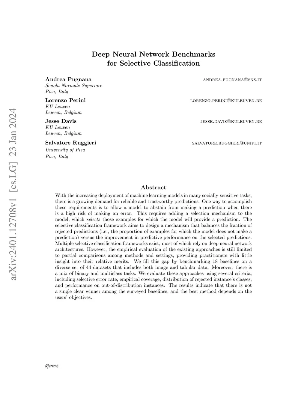 With the increasing deployment of machine learning models in many socially-sensitive tasks, there is a growing demand for reliable and trustworthy predictions. One way to accomplish these requirements is to allow a model to abstain from making a prediction when there is a high risk of making an error. This requires adding a selection mechanism to the model, which selects those examples for which the model will provide a prediction. The selective classification framework aims to design a mechanism that balances the fraction of rejected predictions (i.e., the proportion of examples for which the model does not make a prediction) versus the improvement in predictive performance on the selected predictions. Multiple selective classification frameworks exist, most of which rely on deep neural network architectures. However, the empirical evaluation of the existing approaches is still limited to partial comparisons among methods and settings, providing practitioners with little insight into their relative merits. We fill this gap by benchmarking 18 baselines on a diverse set of 44 datasets that includes both image and tabular data. Moreover, there is a mix of binary and multiclass tasks. We evaluate these approaches using several criteria, including selective error rate, empirical coverage, distribution of rejected instance's classes, and performance on out-of-distribution instances. The results indicate that there is not a single clear winner among the surveyed baselines, and the best method depends on the users' objectives.
