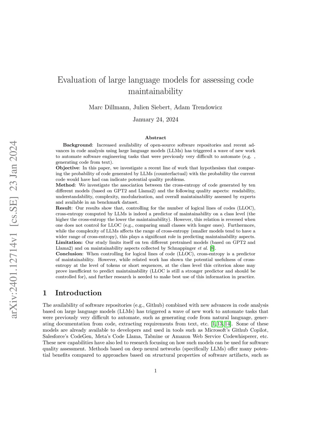 Increased availability of open-source software repositories and recent advances in code analysis using large language models (LLMs) has triggered a wave of new work to automate software engineering tasks that were previously very difficult to automate. In this paper, we investigate a recent line of work that hypothesises that comparing the probability of code generated by LLMs with the probability the current code would have had can indicate potential quality problems. We investigate the association between the cross-entropy of code generated by ten different models (based on GPT2 and Llama2) and the following quality aspects: readability, understandability, complexity, modularisation, and overall maintainability assessed by experts and available in an benchmark dataset. Our results show that, controlling for the number of logical lines of codes (LLOC), cross-entropy computed by LLMs is indeed a predictor of maintainability on a class level (the higher the cross-entropy the lower the maintainability). However, this relation is reversed when one does not control for LLOC (e.g., comparing small classes with longer ones). Furthermore, while the complexity of LLMs affects the range of cross-entropy (smaller models tend to have a wider range of cross-entropy), this plays a significant role in predicting maintainability aspects. Our study limits itself on ten different pretrained models (based on GPT2 and Llama2) and on maintainability aspects collected by Schnappinger et al. When controlling for logical lines of code (LLOC), cross-entropy is a predictor of maintainability. However, while related work has shown the potential usefulness of cross-entropy at the level of tokens or short sequences, at the class level this criterion alone may prove insufficient to predict maintainability and further research is needed to make best use of this information in practice.