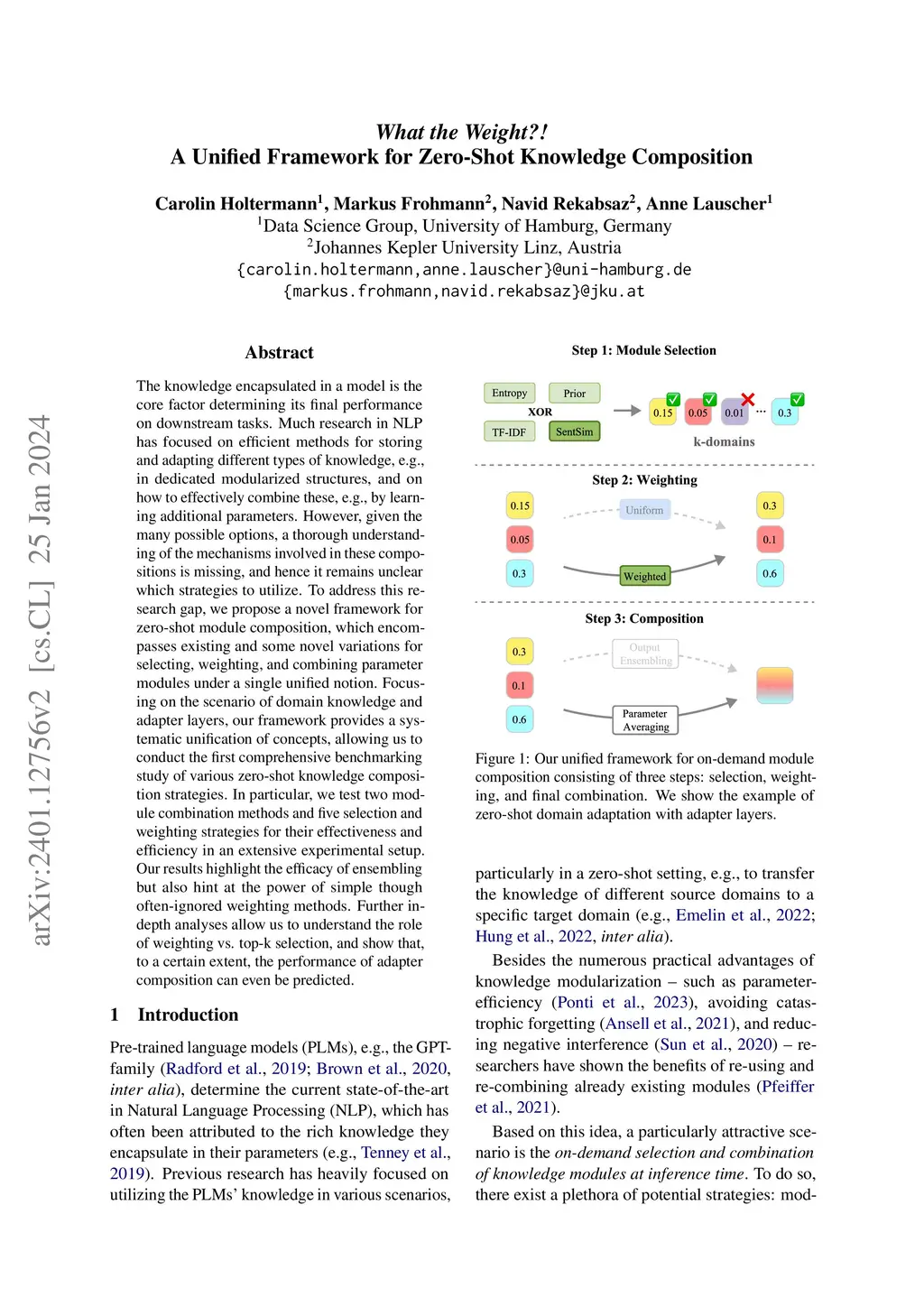The knowledge encapsulated in a model is the core factor determining its final performance on downstream tasks. Much research in NLP has focused on efficient methods for storing and adapting different types of knowledge, e.g., in dedicated modularized structures, and on how to effectively combine these, e.g., by learning additional parameters. However, given the many possible options, a thorough understanding of the mechanisms involved in these compositions is missing, and hence it remains unclear which strategies to utilize. To address this research gap, we propose a novel framework for zero-shot module composition, which encompasses existing and some novel variations for selecting, weighting, and combining parameter modules under a single unified notion. Focusing on the scenario of domain knowledge and adapter layers, our framework provides a systematic unification of concepts, allowing us to conduct the first comprehensive benchmarking study of various zero-shot knowledge composition strategies. In particular, we test two module combination methods and five selection and weighting strategies for their effectiveness and efficiency in an extensive experimental setup. Our results highlight the efficacy of ensembling but also hint at the power of simple though often-ignored weighting methods. Further in-depth analyses allow us to understand the role of weighting vs. top-k selection, and show that, to a certain extent, the performance of adapter composition can even be predicted.