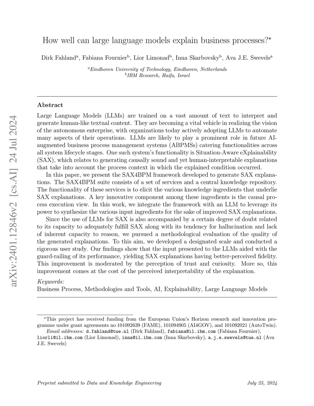 Large Language Models (LLMs) are trained on a vast amount of text to interpret and generate human-like textual content. They are becoming a vital vehicle in realizing the vision of the autonomous enterprise, with organizations today actively adopting LLMs to automate many aspects of their operations. LLMs are likely to play a prominent role in future AI-augmented business process management systems, catering functionalities across all system lifecycle stages. One such system's functionality is Situation-Aware eXplainability (SAX), which relates to generating causally sound and human-interpretable explanations. In this paper, we present the SAX4BPM framework developed to generate SAX explanations. The SAX4BPM suite consists of a set of services and a central knowledge repository. The functionality of these services is to elicit the various knowledge ingredients that underlie SAX explanations. A key innovative component among these ingredients is the causal process execution view. In this work, we integrate the framework with an LLM to leverage its power to synthesize the various input ingredients for the sake of improved SAX explanations. Since the use of LLMs for SAX is also accompanied by a certain degree of doubt related to its capacity to adequately fulfill SAX along with its tendency for hallucination and lack of inherent capacity to reason, we pursued a methodological evaluation of the perceived quality of the generated explanations. We developed a designated scale and conducted a rigorous user study. Our findings show that the input presented to the LLMs aided with the guard-railing of its performance, yielding SAX explanations having better-perceived fidelity. This improvement is moderated by the perception of trust and curiosity. More so, this improvement comes at the cost of the perceived interpretability of the explanation.