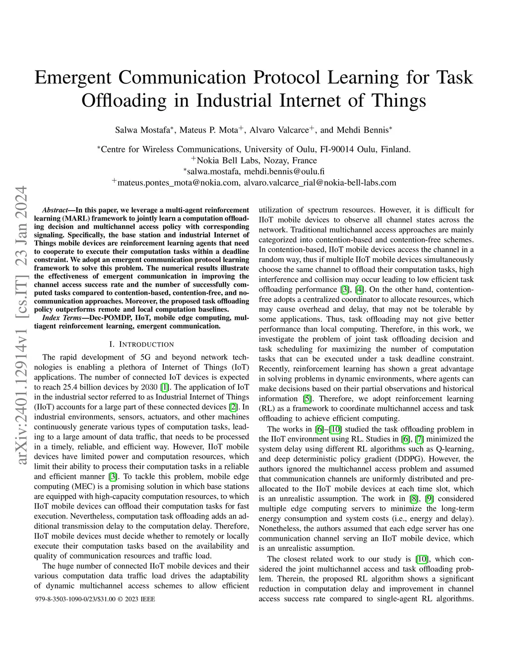 In this paper, we leverage a multi-agent reinforcement learning (MARL) framework to jointly learn a computation offloading decision and multichannel access policy with corresponding signaling. Specifically, the base station and industrial Internet of Things mobile devices are reinforcement learning agents that need to cooperate to execute their computation tasks within a deadline constraint. We adopt an emergent communication protocol learning framework to solve this problem. The numerical results illustrate the effectiveness of emergent communication in improving the channel access success rate and the number of successfully computed tasks compared to contention-based, contention-free, and no-communication approaches. Moreover, the proposed task offloading policy outperforms remote and local computation baselines.