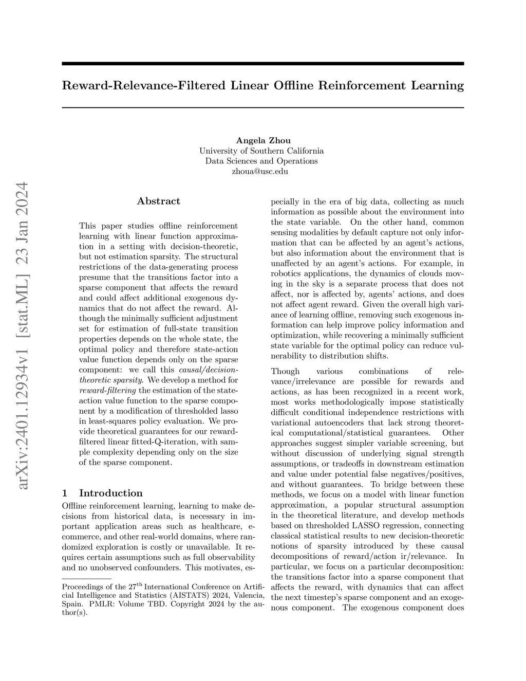 This paper studies offline reinforcement learning with linear function approximation in a setting with decision-theoretic, but not estimation sparsity. The structural restrictions of the data-generating process presume that the transitions factor into a sparse component that affects the reward and could affect additional exogenous dynamics that do not affect the reward. Although the minimally sufficient adjustment set for estimation of full-state transition properties depends on the whole state, the optimal policy and therefore state-action value function depends only on the sparse component: we call this causal/decision-theoretic sparsity. We develop a method for reward-filtering the estimation of the state-action value function to the sparse component by a modification of thresholded lasso in least-squares policy evaluation. We provide theoretical guarantees for our reward-filtered linear fitted-Q-iteration, with sample complexity depending only on the size of the sparse component.