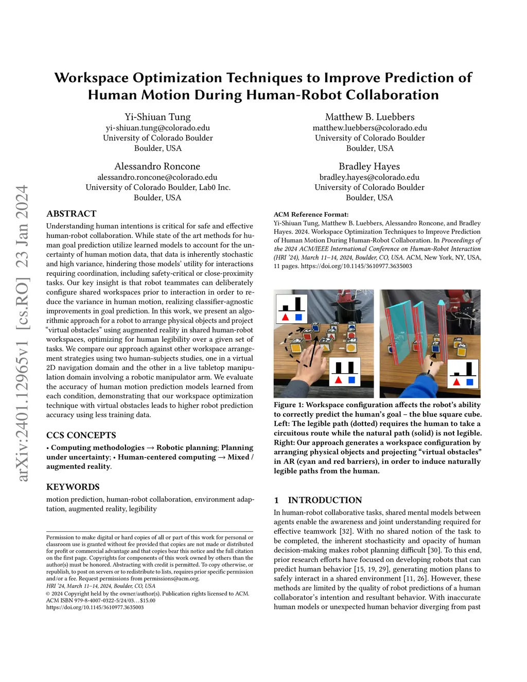 Understanding human intentions is critical for safe and effective human-robot collaboration. While state of the art methods for human goal prediction utilize learned models to account for the uncertainty of human motion data, that data is inherently stochastic and high variance, hindering those models' utility for interactions requiring coordination, including safety-critical or close-proximity tasks. Our key insight is that robot teammates can deliberately configure shared workspaces prior to interaction in order to reduce the variance in human motion, realizing classifier-agnostic improvements in goal prediction. In this work, we present an algorithmic approach for a robot to arrange physical objects and project "virtual obstacles" using augmented reality in shared human-robot workspaces, optimizing for human legibility over a given set of tasks. We compare our approach against other workspace arrangement strategies using two human-subjects studies, one in a virtual 2D navigation domain and the other in a live tabletop manipulation domain involving a robotic manipulator arm. We evaluate the accuracy of human motion prediction models learned from each condition, demonstrating that our workspace optimization technique with virtual obstacles leads to higher robot prediction accuracy using less training data.