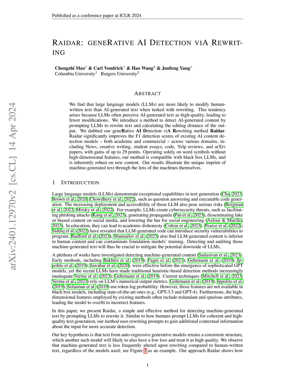We find that large language models (LLMs) are more likely to modify human-written text than AI-generated text when tasked with rewriting. This tendency arises because LLMs often perceive AI-generated text as high-quality, leading to fewer modifications. We introduce a method to detect AI-generated content by prompting LLMs to rewrite text and calculating the editing distance of the output. We dubbed our geneRative AI Detection viA Rewriting method Raidar. Raidar significantly improves the F1 detection scores of existing AI content detection models -- both academic and commercial -- across various domains, including News, creative writing, student essays, code, Yelp reviews, and arXiv papers, with gains of up to 29 points. Operating solely on word symbols without high-dimensional features, our method is compatible with black box LLMs, and is inherently robust on new content. Our results illustrate the unique imprint of machine-generated text through the lens of the machines themselves.