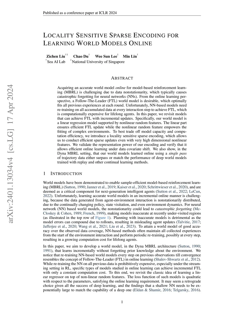 Acquiring an accurate world model online for model-based reinforcement learning (MBRL) is challenging due to data nonstationarity, which typically causes catastrophic forgetting for neural networks (NNs). From the online learning perspective, a Follow-The-Leader (FTL) world model is desirable, which optimally fits all previous experiences at each round. Unfortunately, NN-based models need re-training on all accumulated data at every interaction step to achieve FTL, which is computationally expensive for lifelong agents. In this paper, we revisit models that can achieve FTL with incremental updates. Specifically, our world model is a linear regression model supported by nonlinear random features. The linear part ensures efficient FTL update while the nonlinear random feature empowers the fitting of complex environments. To best trade off model capacity and computation efficiency, we introduce a locality sensitive sparse encoding, which allows us to conduct efficient sparse updates even with very high dimensional nonlinear features. We validate the representation power of our encoding and verify that it allows efficient online learning under data covariate shift. We also show, in the Dyna MBRL setting, that our world models learned online using a single pass of trajectory data either surpass or match the performance of deep world models trained with replay and other continual learning methods.