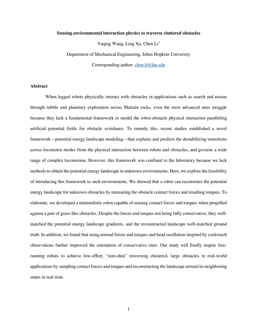 The long-standing, dominant approach to robotic obstacle negotiation relies on mapping environmental geometry to avoid obstacles. However, this approach does not allow for traversal of cluttered obstacles, hindering applications such as search and rescue operations through earthquake rubble and exploration across lunar and Martian rocks. To overcome this challenge, robots must further sense and utilize environmental physical interactions to control themselves to traverse obstacles. Recently, a physics-based approach has been established towards this vision. Self-propelled robots interacting with obstacles results in a potential energy landscape. On this landscape, to traverse obstacles, a robot must escape from certain landscape basins that attract it into failure modes, to reach other basins that lead to successful modes. Thus, sensing the potential energy landscape is crucial. Here, we developed new methods and performed systematic experiments to demonstrate that the potential energy landscape can be estimated by sensing environmental physical interaction. We developed a minimalistic robot capable of sensing obstacle contact forces and torques for systematic experiments over a wide range of parameter space. Surprisingly, although these forces and torques are not fully conservative, they match the potential energy landscape gradients that are conservative forces and torques, enabling an accurate estimation of the potential energy landscape. Additionally, a bio-inspired strategy further enhanced estimation accuracy. Our results provided a foundation for further refining these methods for use in free-locomoting robots. Our study is a key step in establishing a new physics-based approach for robots to traverse clustered obstacles to advance their mobility in complex, real-world environments.