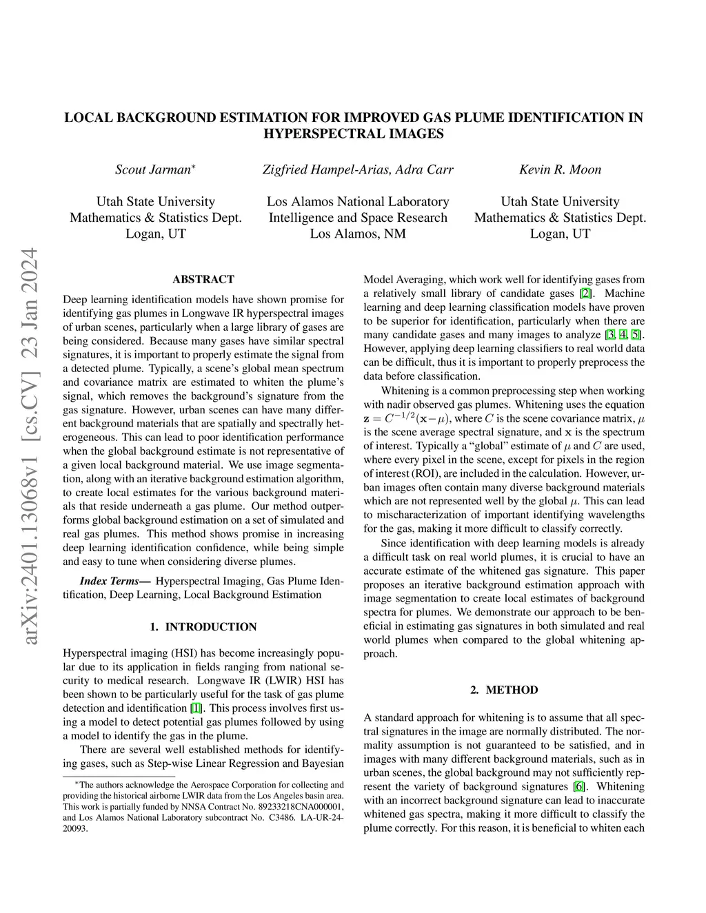 Deep learning identification models have shown promise for identifying gas plumes in Longwave IR hyperspectral images of urban scenes, particularly when a large library of gases are being considered. Because many gases have similar spectral signatures, it is important to properly estimate the signal from a detected plume. Typically, a scene's global mean spectrum and covariance matrix are estimated to whiten the plume's signal, which removes the background's signature from the gas signature. However, urban scenes can have many different background materials that are spatially and spectrally heterogeneous. This can lead to poor identification performance when the global background estimate is not representative of a given local background material. We use image segmentation, along with an iterative background estimation algorithm, to create local estimates for the various background materials that reside underneath a gas plume. Our method outperforms global background estimation on a set of simulated and real gas plumes. This method shows promise in increasing deep learning identification confidence, while being simple and easy to tune when considering diverse plumes.